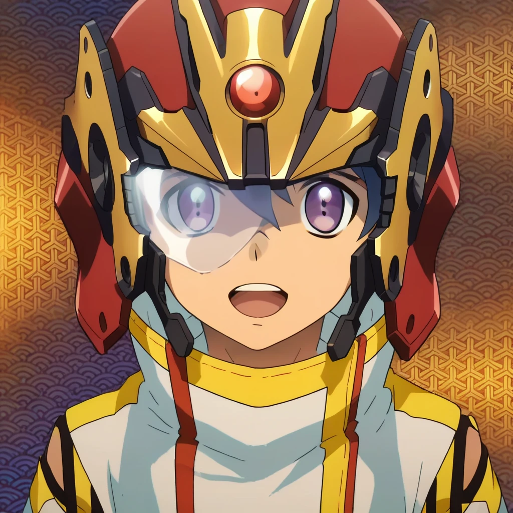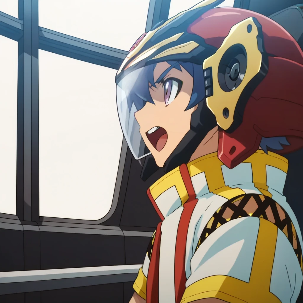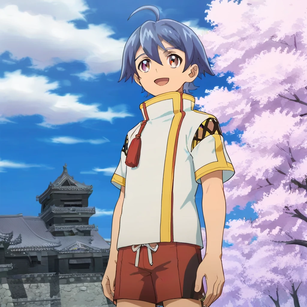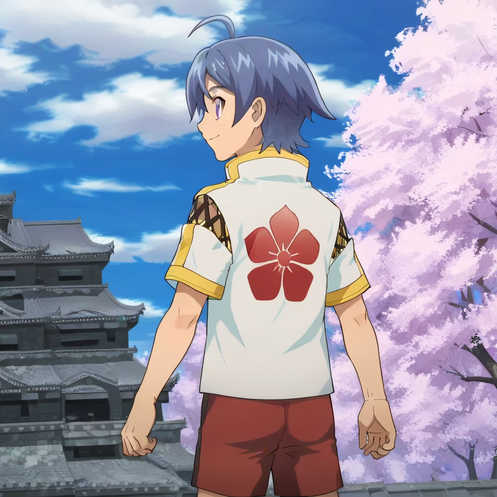 Prompts: male, blue hair, ahoge, purple eyes, white jacket, white print jacket, high collar, short sleeves, shorts, socks, shoes, helmet, outdoors (field/sky/cloud/castle/cherry blossoms), pattern background, cockpit