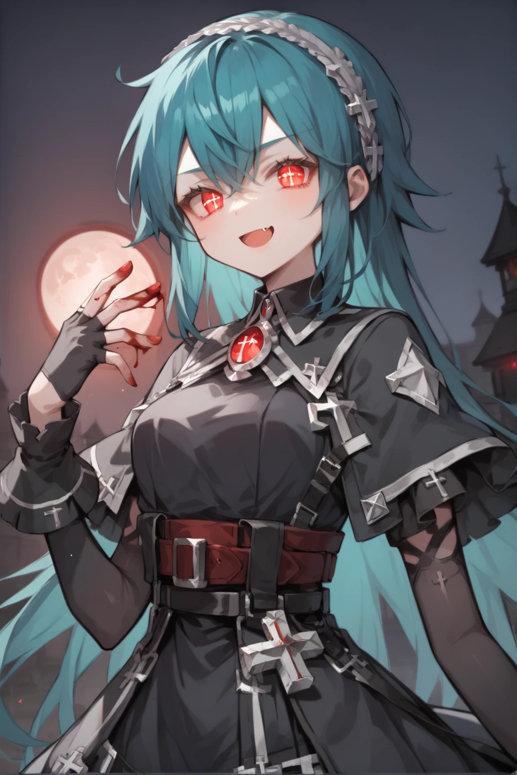 20m-rft45, cross-shaped_pupils, symbol-shaped_pupils, aqua hair, long hair, 1girl, red eyes, black dress, bangs, long sleeves, black capelet, hair between eyes, jewelry, belt, black thighhighs, thighhighs, fingerless gloves, headdress