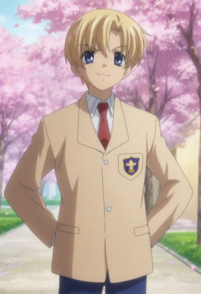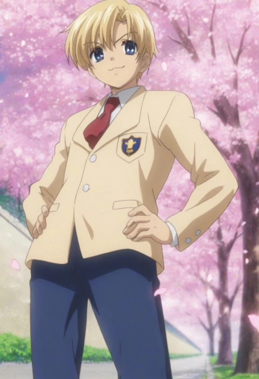 Youhei Sunohara, blonde hair, blue eyes, yellow blazer, white collared undershirt, red necktie, blue pants