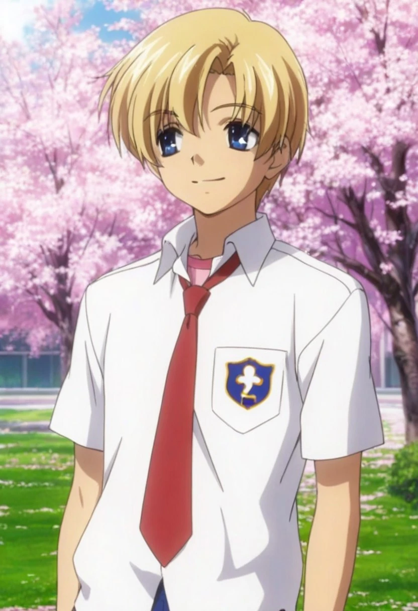 Youhei Sunohara, blonde hair, blue eyes, white collared shirt, short sleeves, pink undershirt, red necktie, blue pants