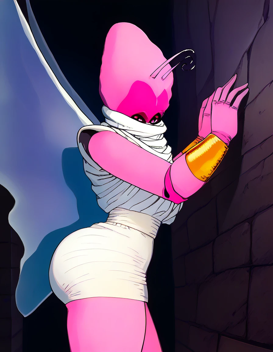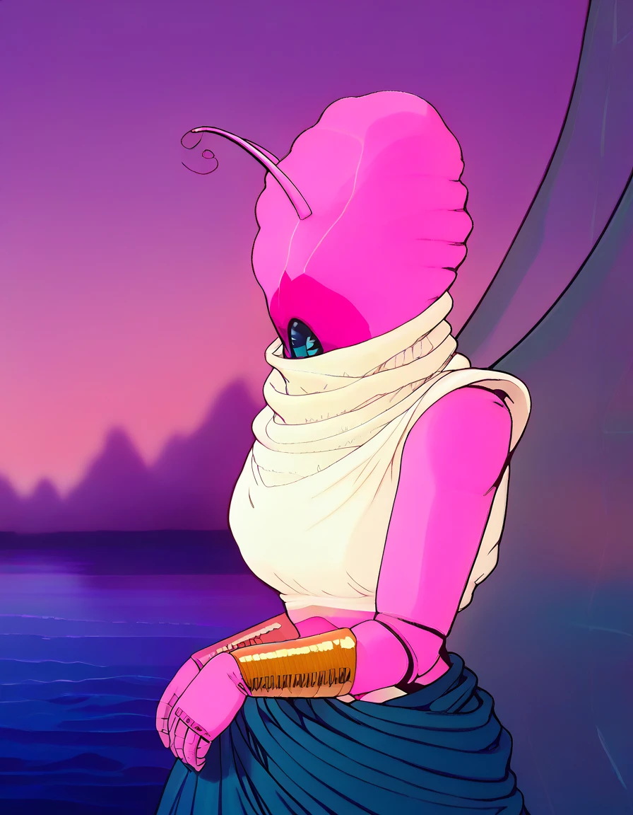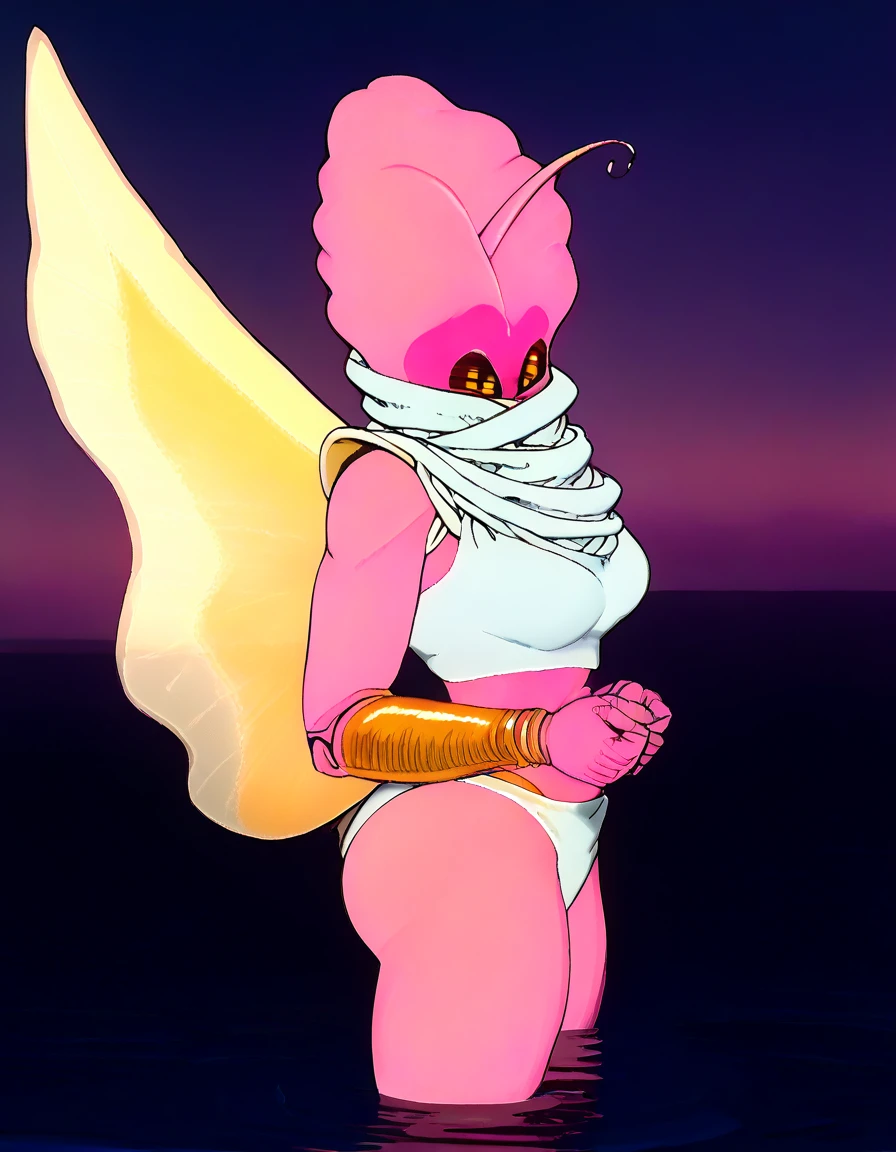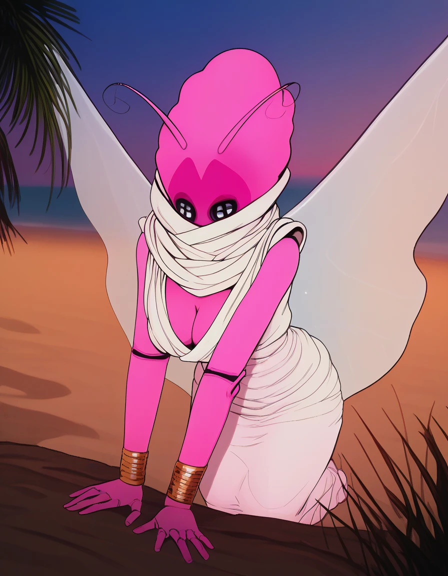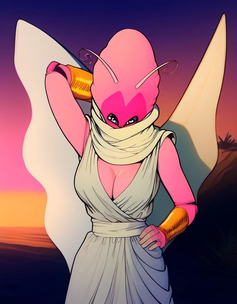antennae, pink skin, colored skin, black eyes, no humans, wings, (creature), night, jewelry, bracelet, bright pupils, scarf, pink sky, white robe, cape, insect wings, colored sclera, white pupils, bug