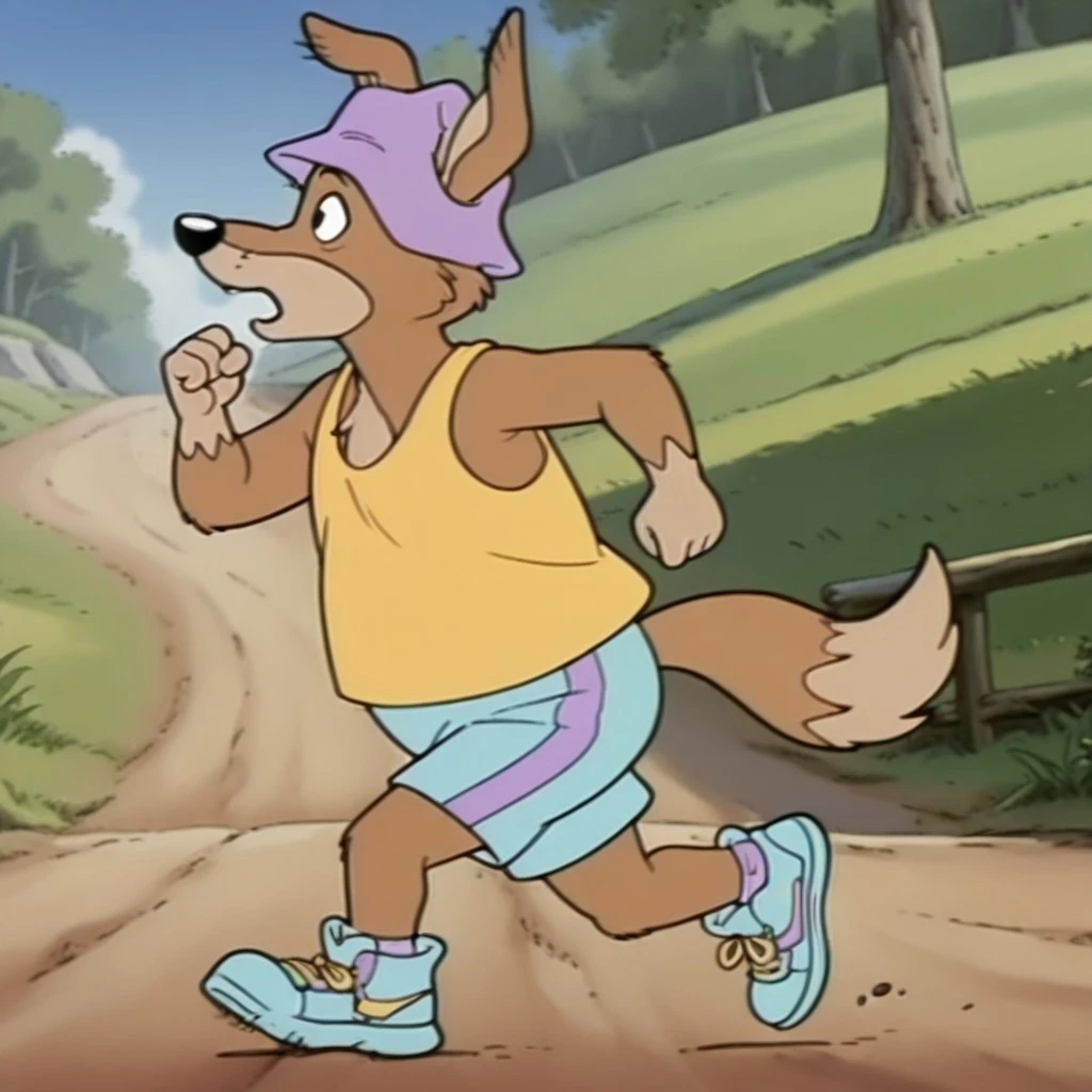 purple hat, yellow tank top, blue shorts, blue sneakers