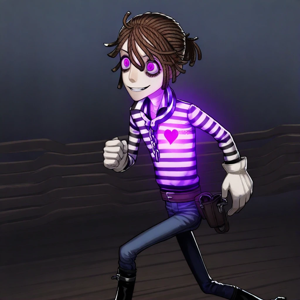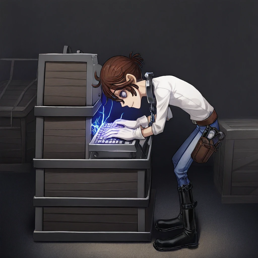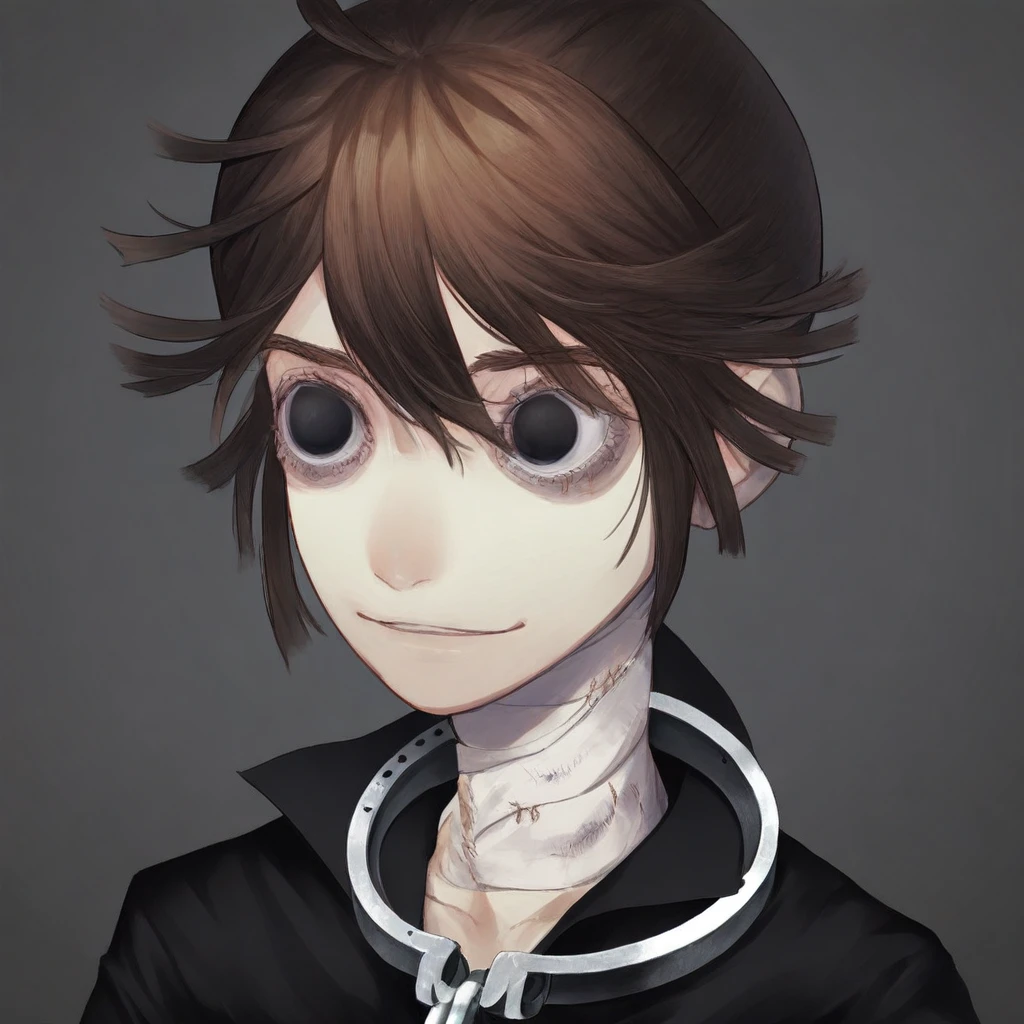 IDV_Luca, black and white shirt, brown hair, toolbelt, shackle around neck, white gloves