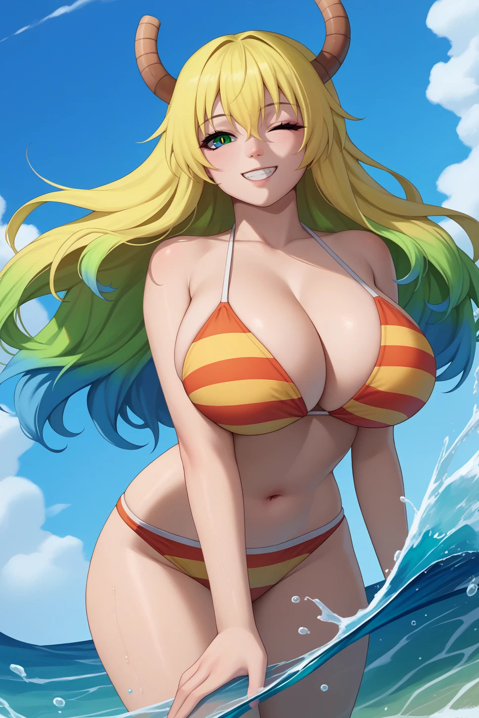 Appearance : mlc, dragon horns, huge breasts, heterochromia, green eyes, blue eyes, slit pupils, multicolored hair, blonde hair, green hair, blue hair, hair between eyes