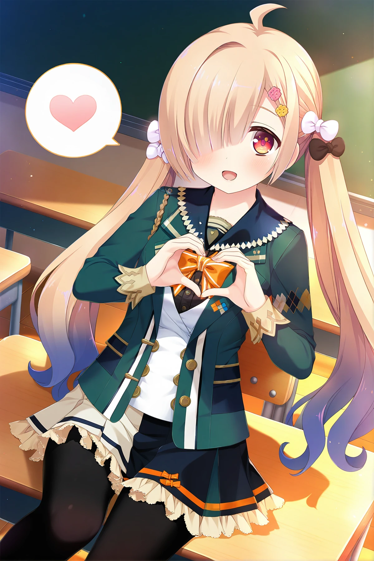 校服:uta school, blonde hair, multicolored hair, long hair, twintails, ahoge, hair over one eye, hair ornament, hairclip, red eyes, bow, orange bowtie, black collar, long sleeves, green jacket, jacket, yellow button, school uniform, pleated skirt, frilled skirt, two-tone skirt, skirt, white and black skirt, black pantyhose, pantyhose, shoes, brown footwear