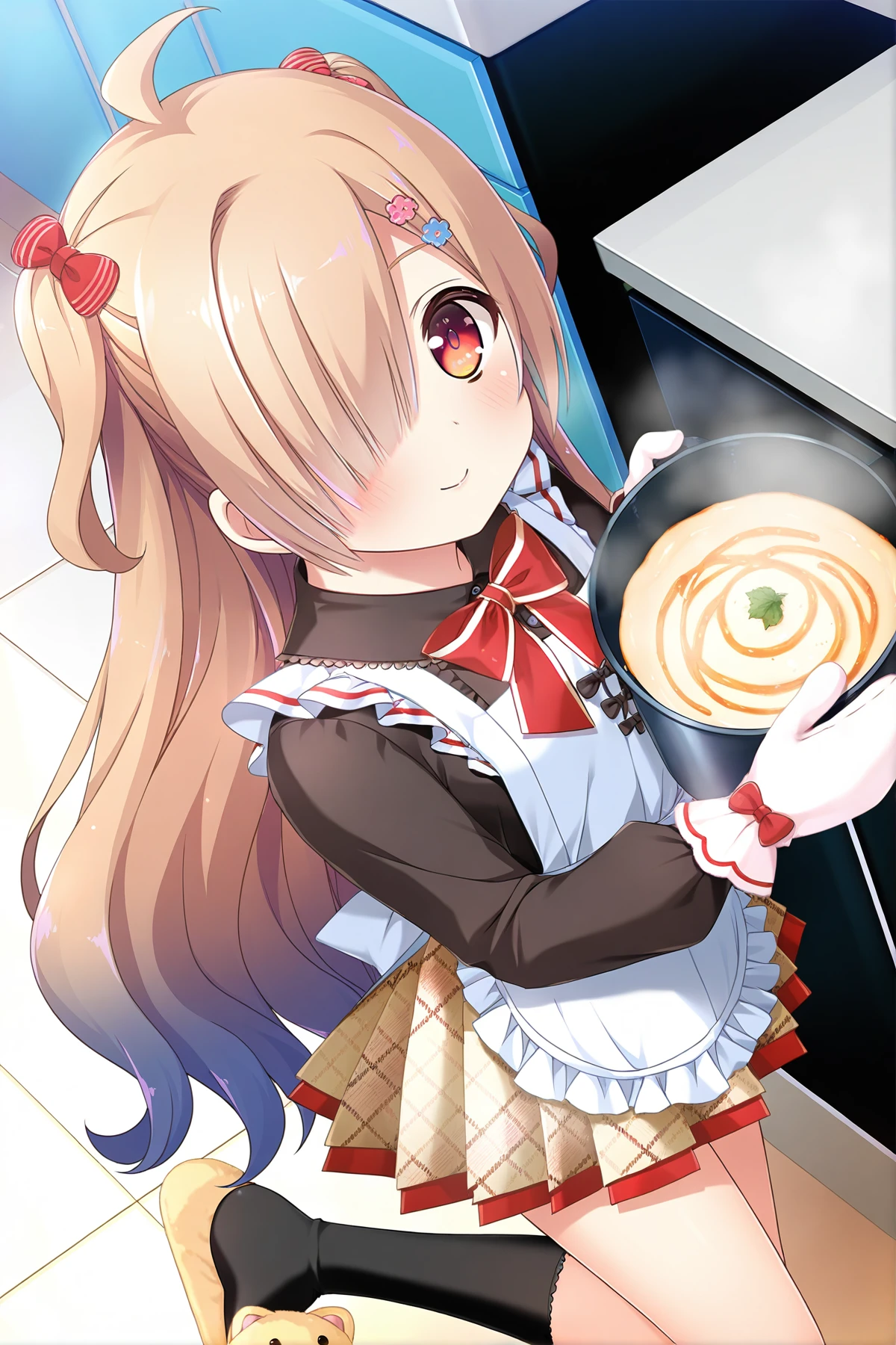 私服(带围裙):uta daily, brown hair, multicolored hair, gradient hair, long hair, very long hair, two side up, ahoge, hair over one eye, hair ornament, hairclip, hair bobbles, heart hair ornament, red eyes, bow, red bow, collared shirt, dress shirt, black shirt, shirt, long sleeves, puffy sleeves, puffy long sleeves, sleeves past wrists, frills, apron, white apron, frilled apron, plaid, dress, pleated dress, brown dress, plaid dress, pleated skirt, plaid skirt, skirt, black socks, socks, mary janes, pink footwear, shoes