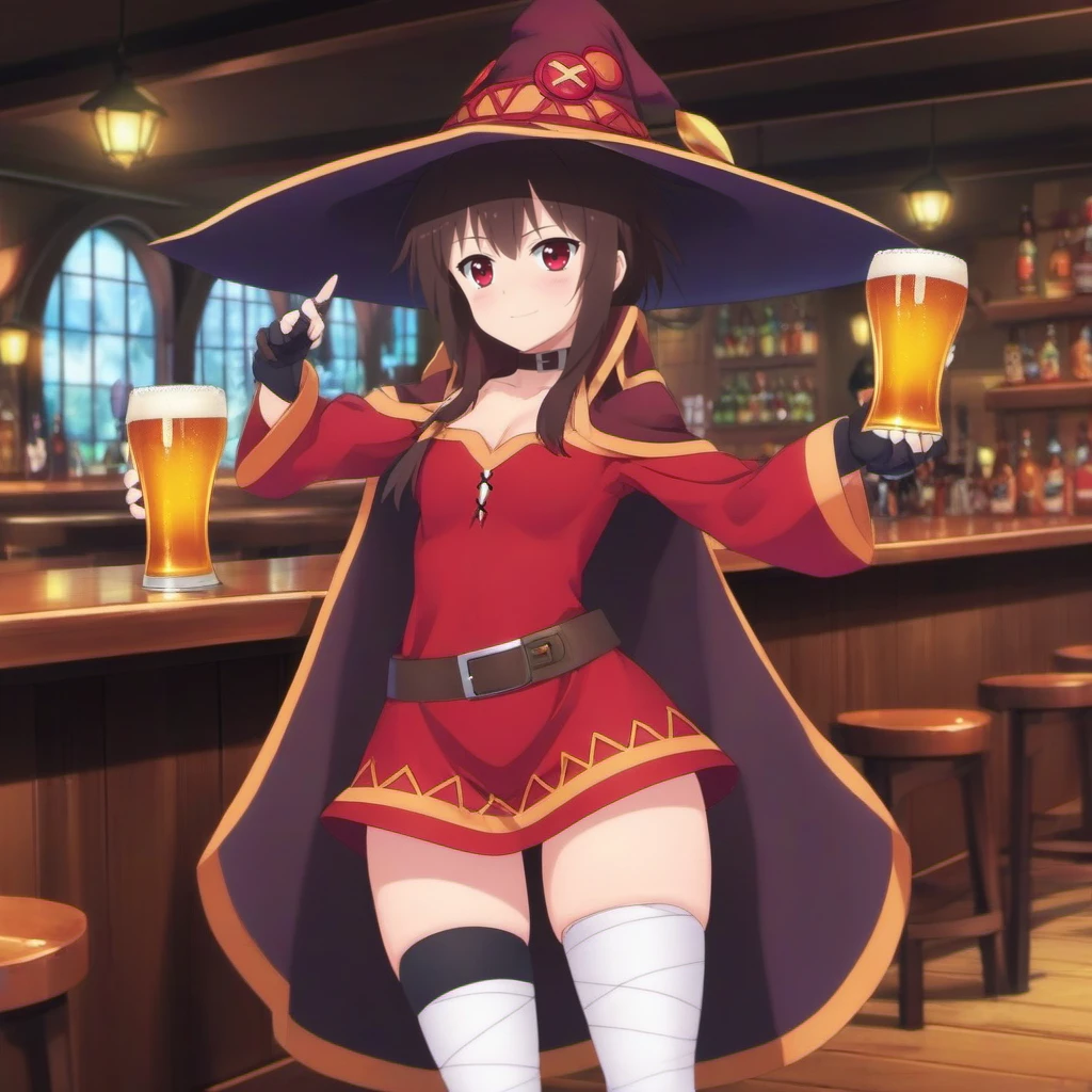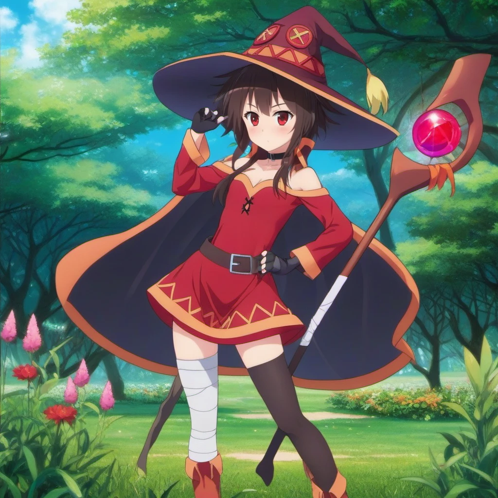 1girl, witch hat, blush, thighhighs, staff, fingerless gloves, bandaged leg, red dress, thighhighs