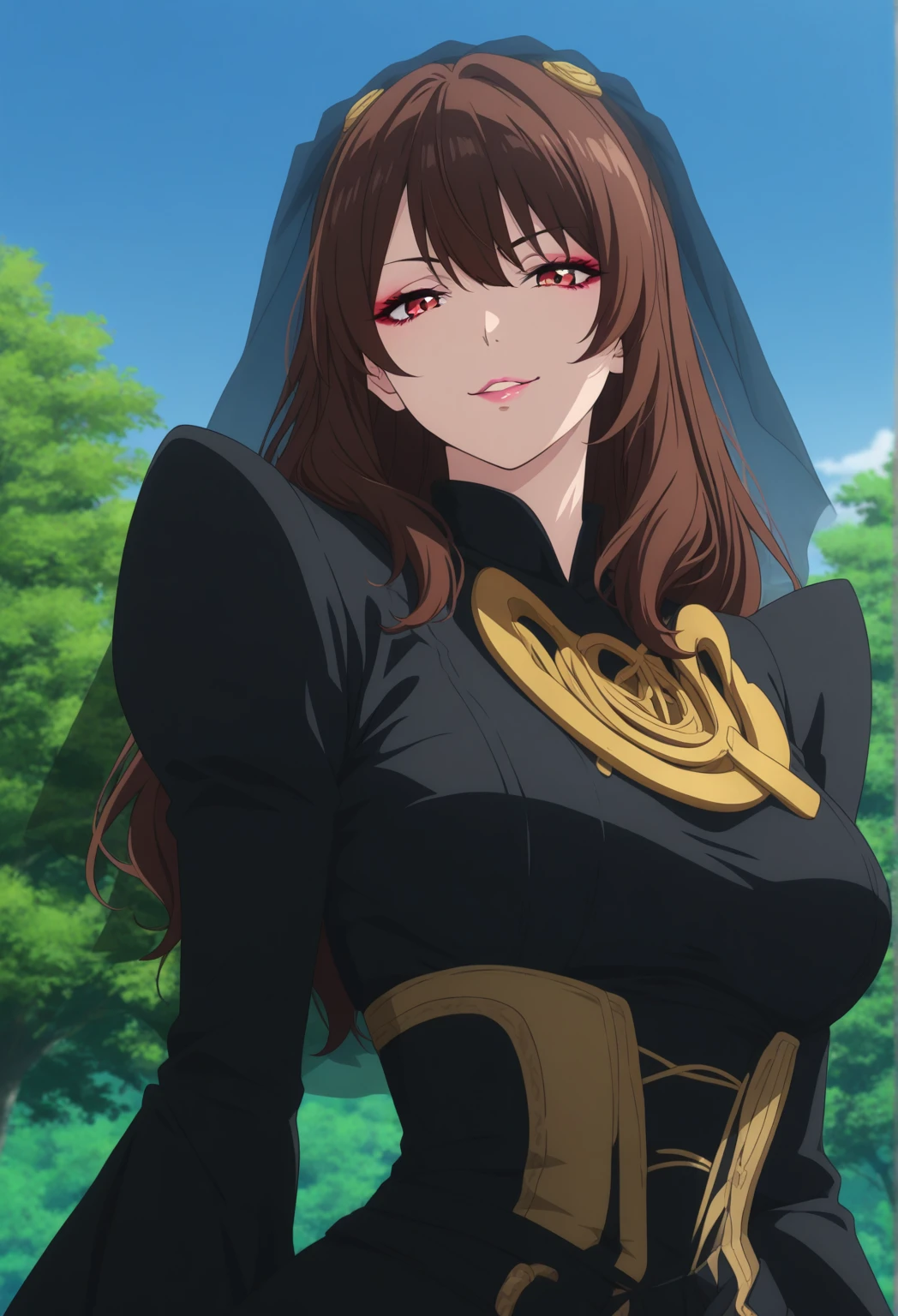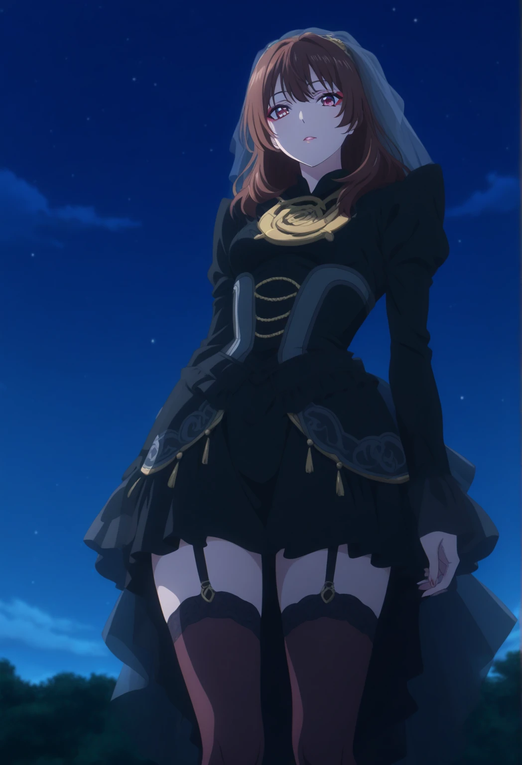 Recommended prompt: gotchalachesis, makeup, eyeliner, long hair, brown hair, two_side_up, eyeliner, veil, black dress, stockings,