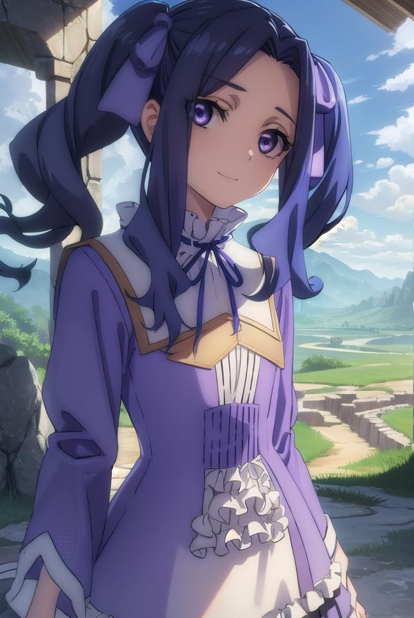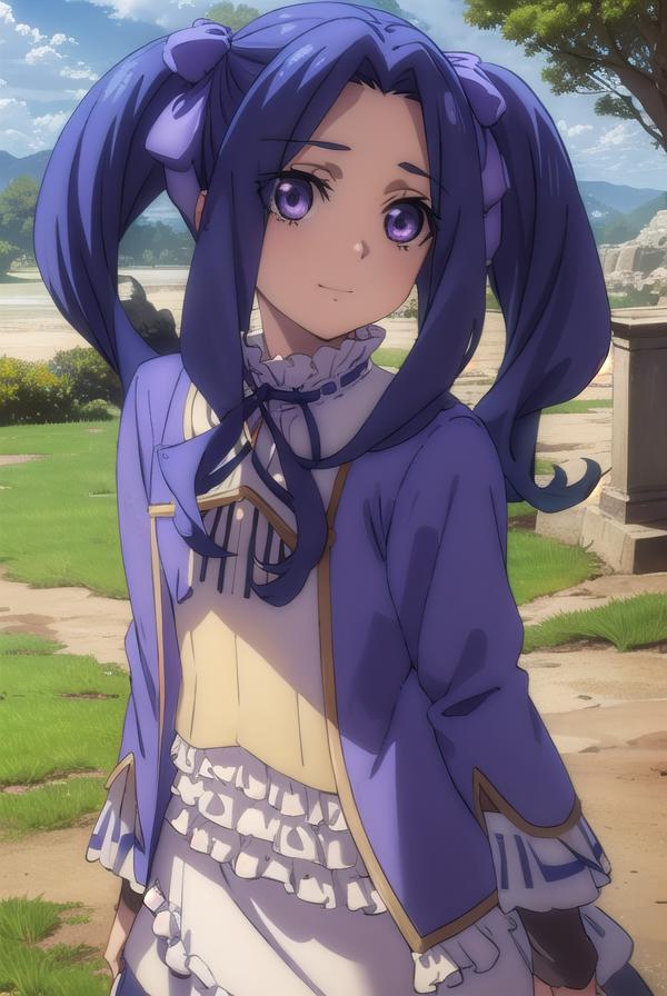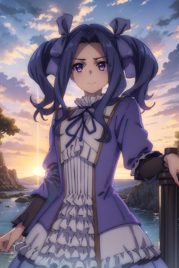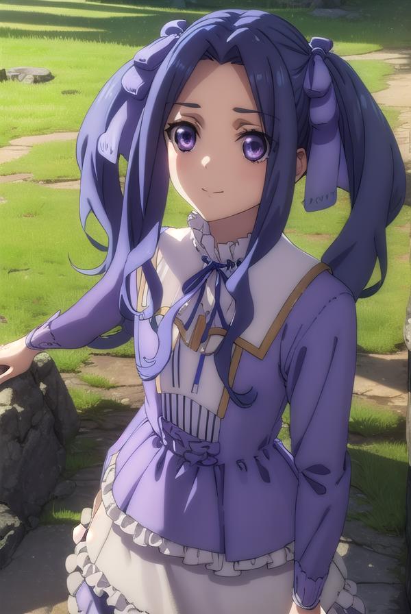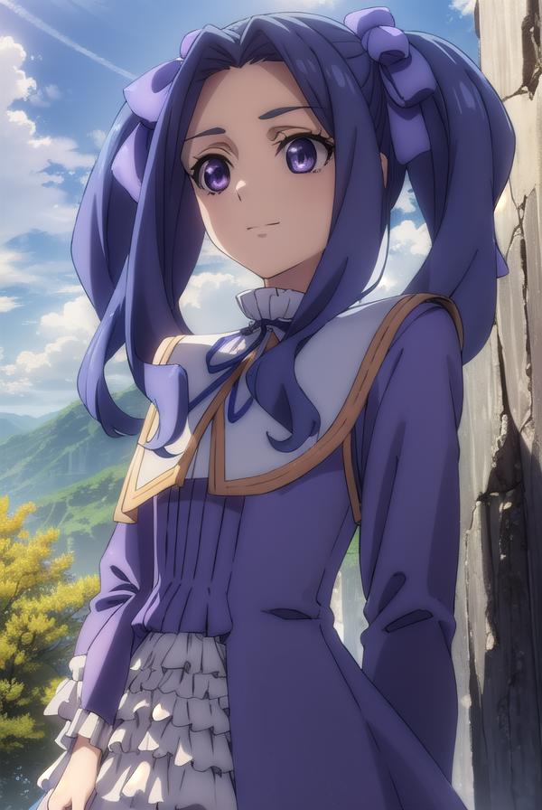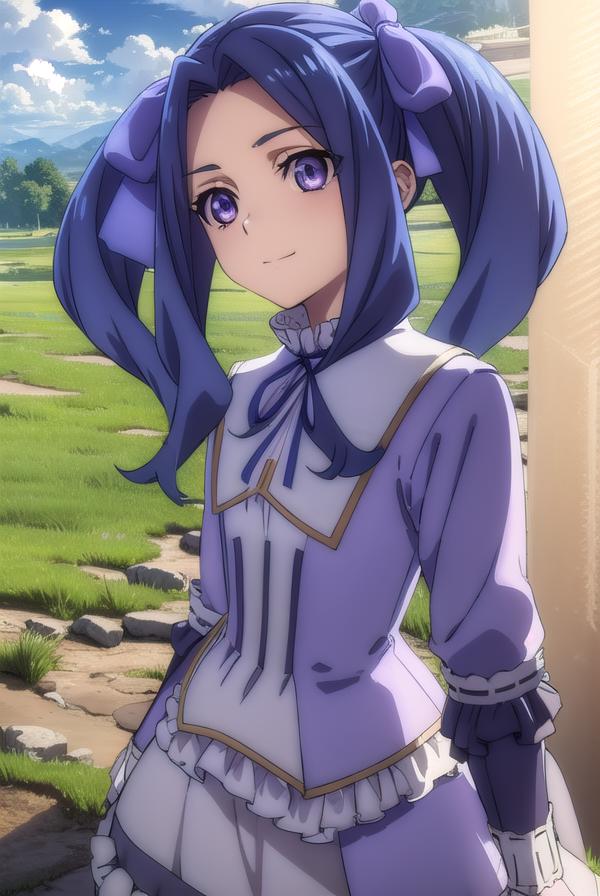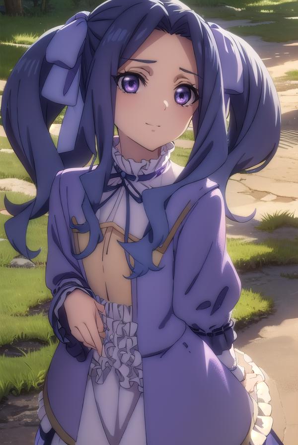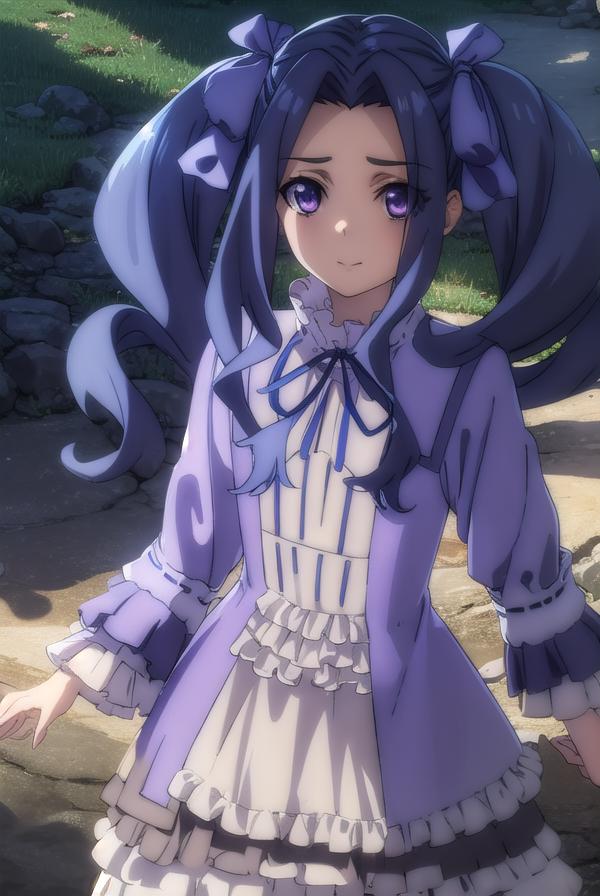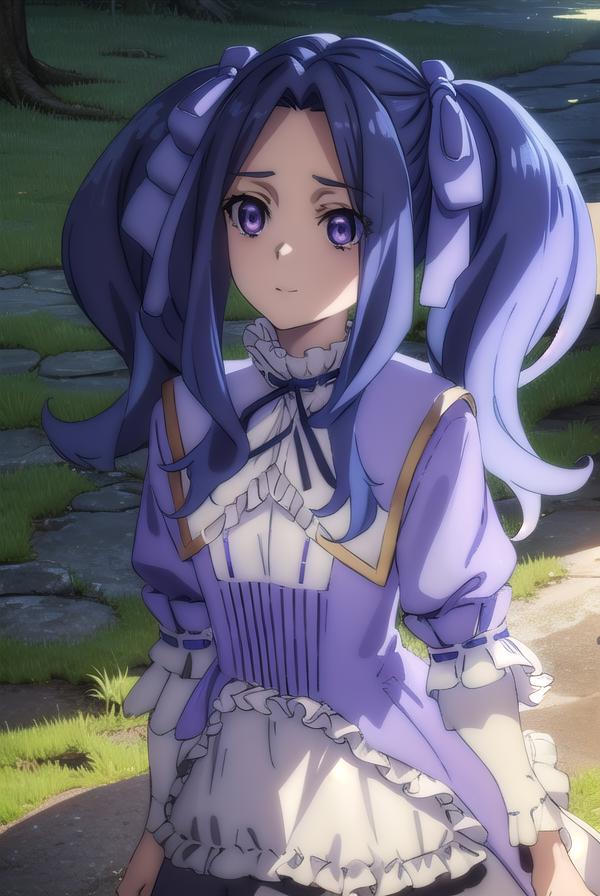 melty q melromarc, long hair, ribbon, twintails, blue hair, (purple eyes:1.1), hair ribbon, purple ribbon, (parted bangs:1.5),