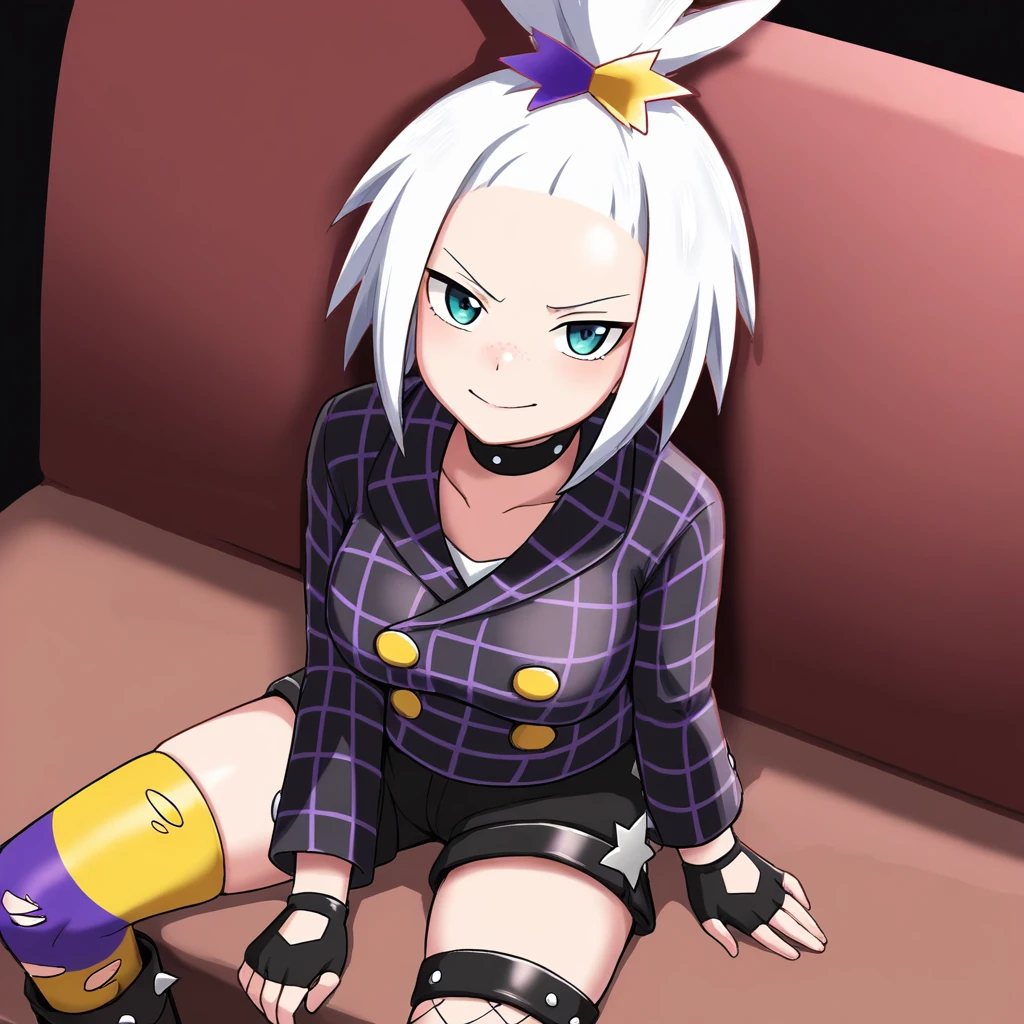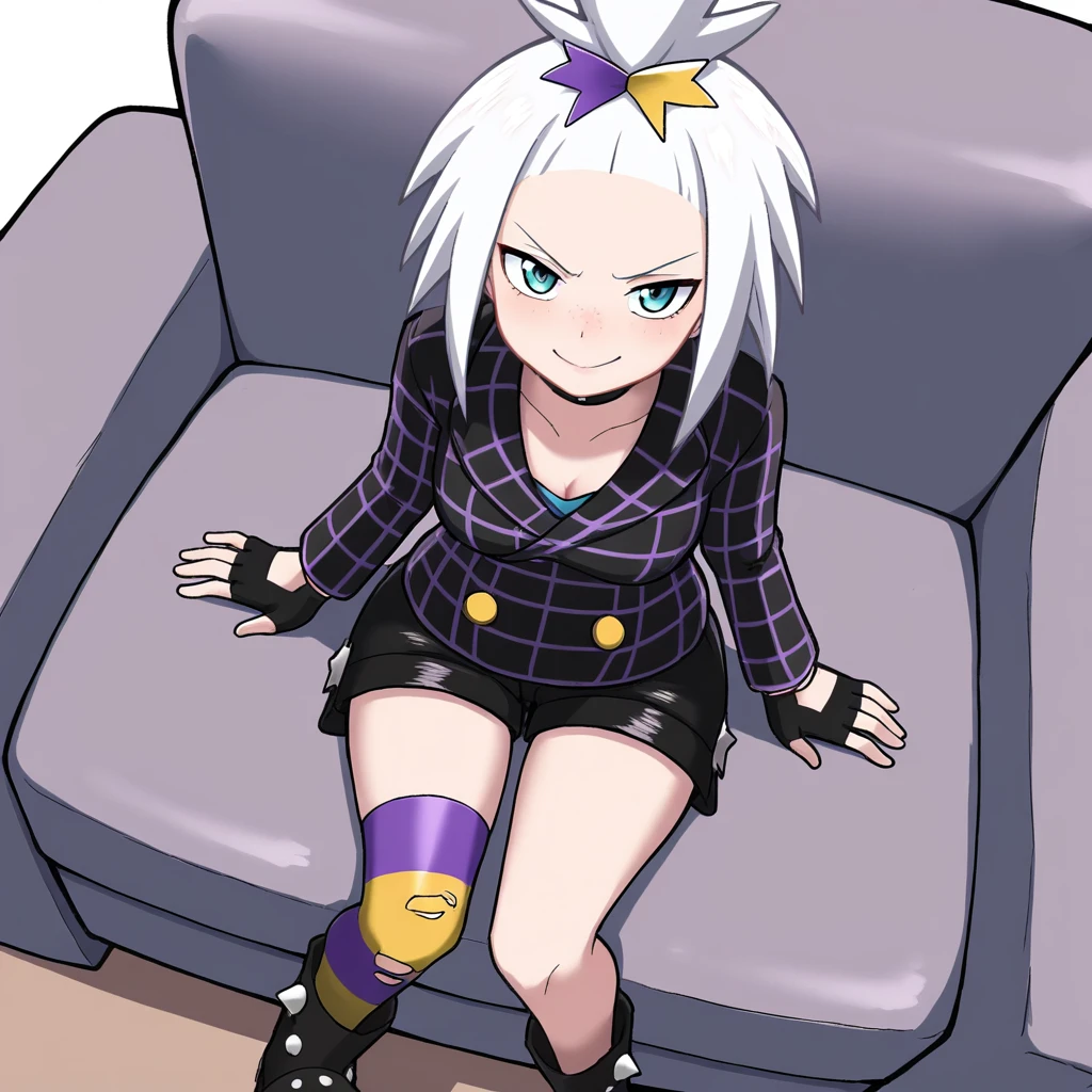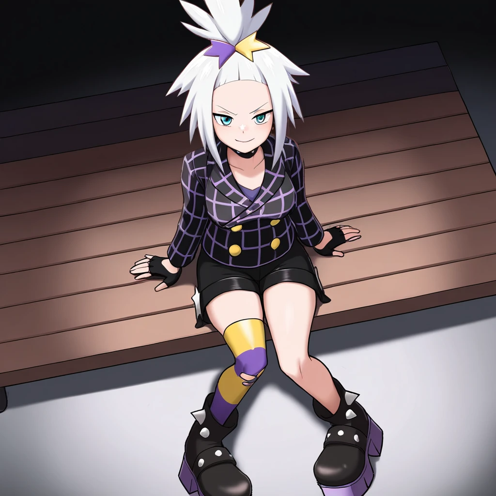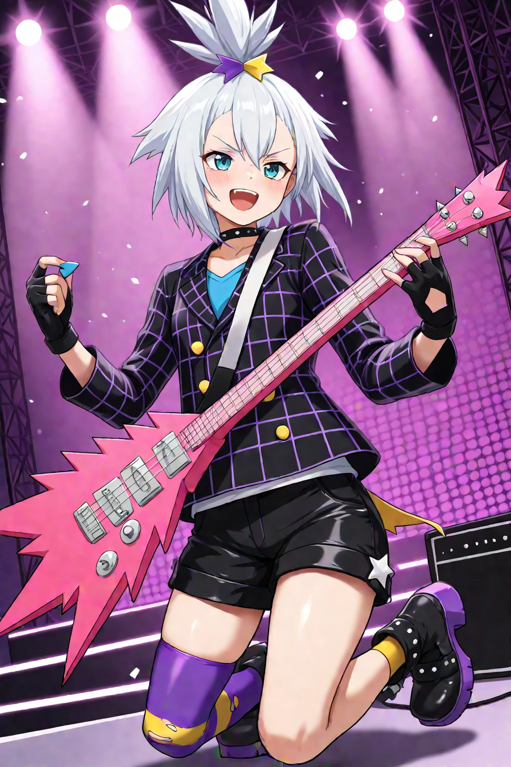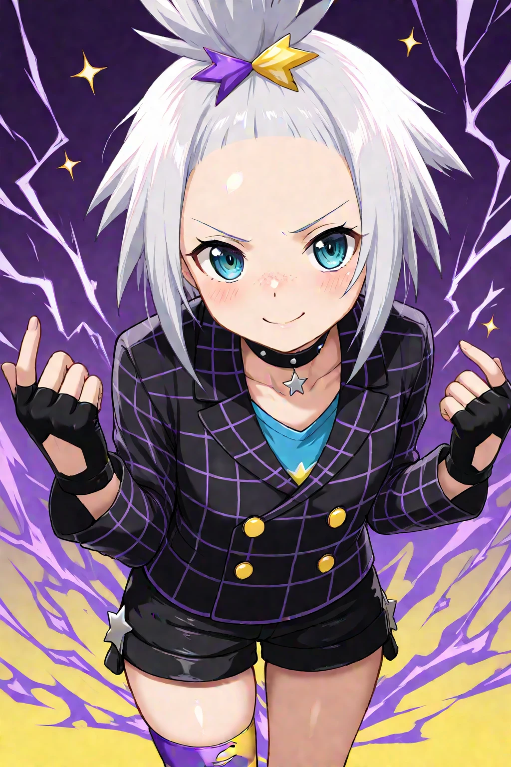 choker, collared jacket, black jacket, long sleeves, yellow buttons, blue shirt, black shorts, fingerless gloves, black gloves, single thighhigh, torn thighhigs, striped thighhighs, purple socks, yellow socks, platform boots, black footwear