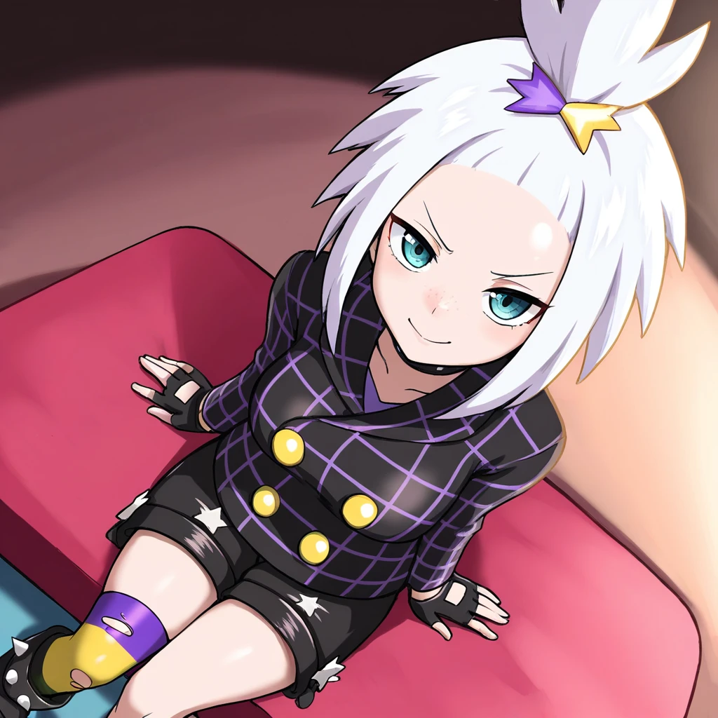 sygroxie, blue eyes, white hair, topknot, hair ornament, spiked hair