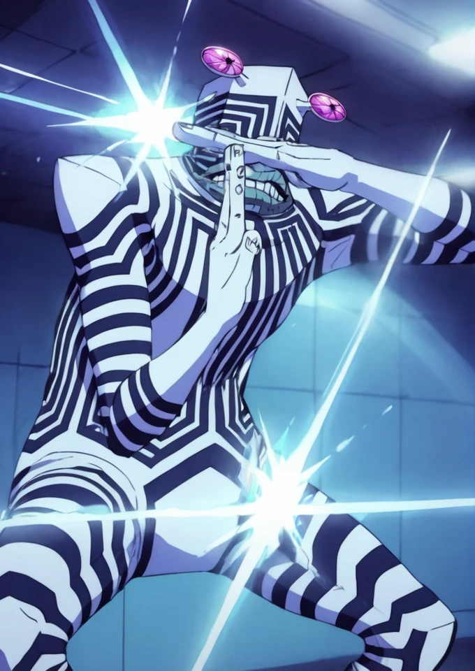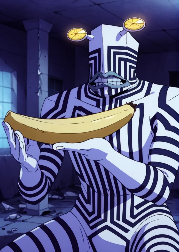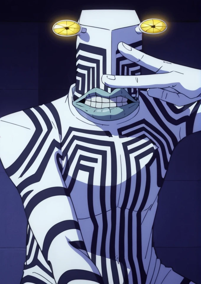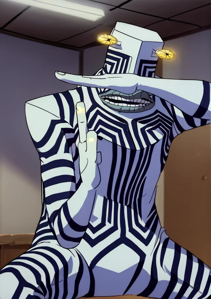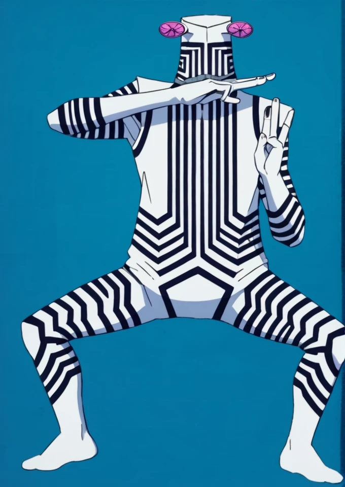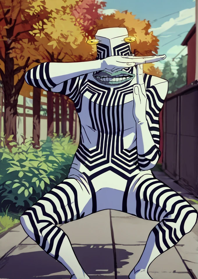snail head, snail eyes, large mouth, teeth, white body, posing arms, hands make a T sign, black fractal stripes, zebra patterns