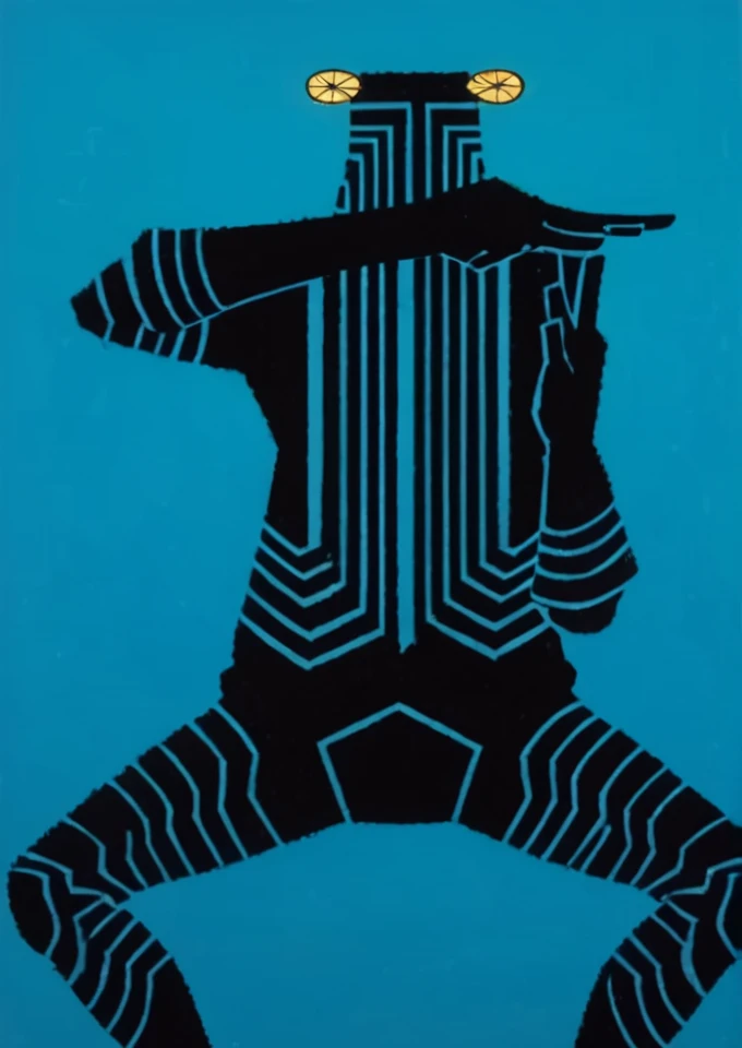 prompt: alien, snail head, snail eyes, large mouth, teeth, white body, black fractal stripes, zebra patterns, full body, indoors, blue room with tv screens