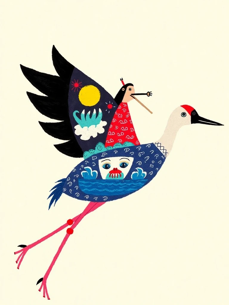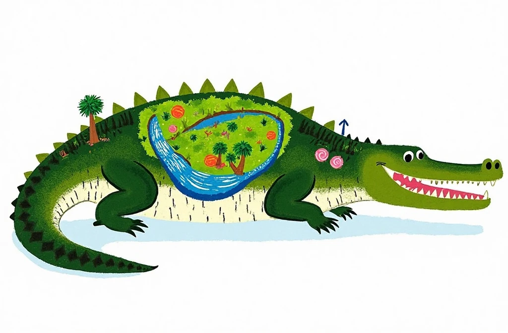 Animal shapes integrated with patterns, focusing on a crocodile and a crane. Merge water - related patterns and cultural motifs to create a unique visual.