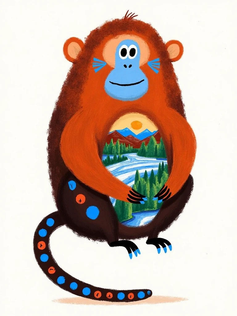 Animal shapes integrated with patterns, focusing on a monkey and a crane. Merge celestial patterns, like starry skies, into the animal designs.