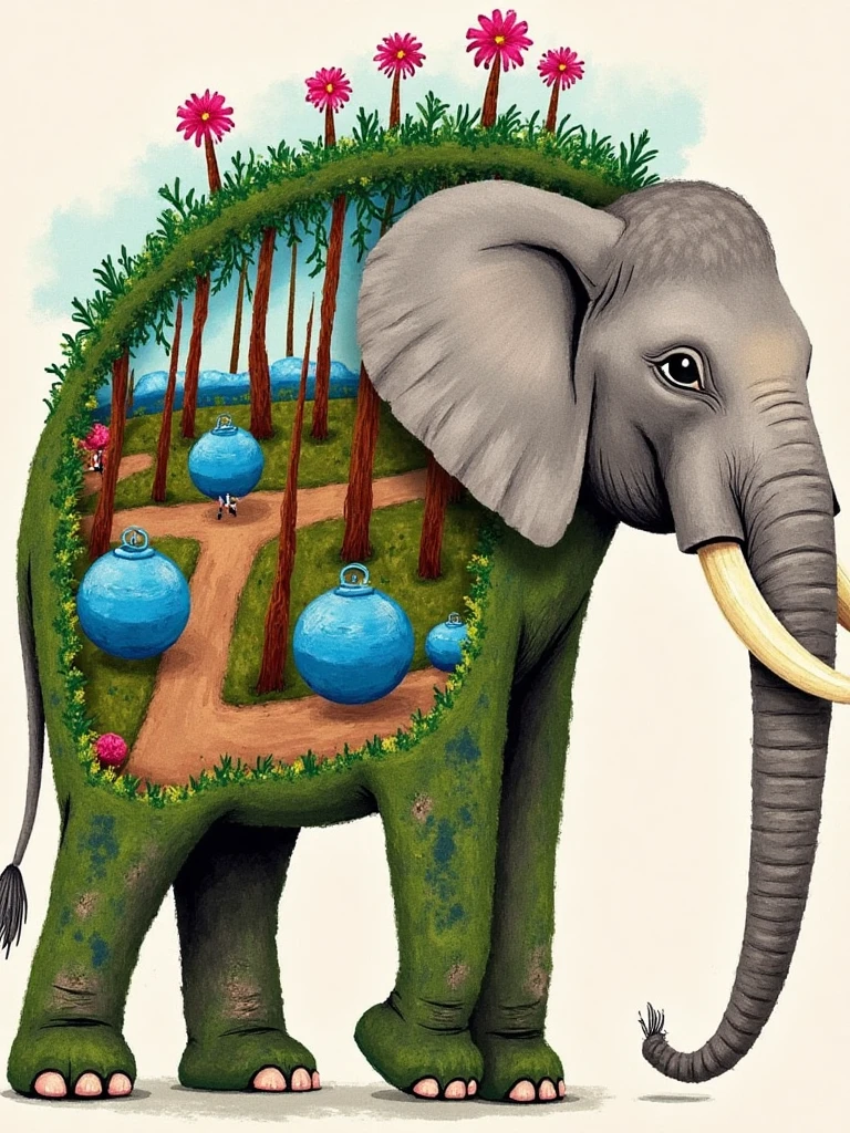 Animal shapes integrated with patterns, showcasing an elephant and a monkey. Combine intricate garden scenes and colorful designs within the animal silhouettes.
