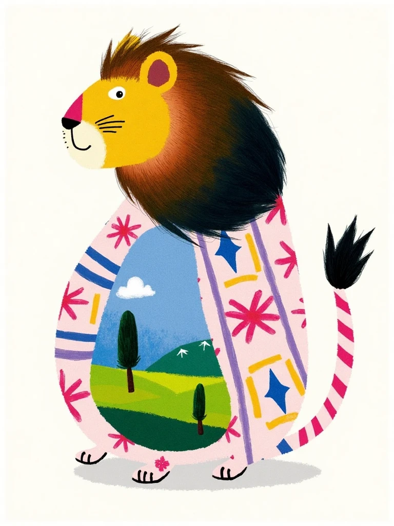 Animal shapes integrated with patterns, centering on a lion and a rabbit. Use floral patterns and soft pastels to create a gentle, artistic look.