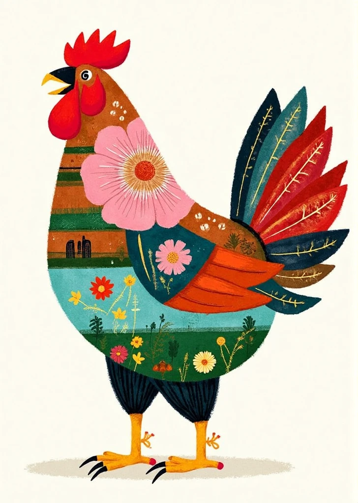 Animal shapes integrated with patterns, featuring a rooster and a rabbit. Blend traditional folk patterns and bright colors for a festive feel.