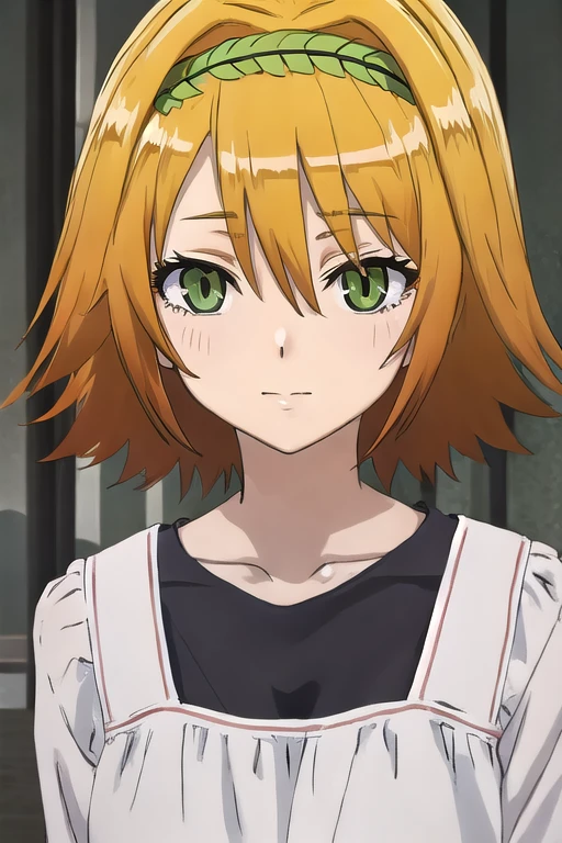 Madoka Harumi, 1girl, solo, short_hair, hairband, green_eyes, orange_hair, brown_hair, blonde_hair, collarbone, anime_coloring, hair_between_eyes,