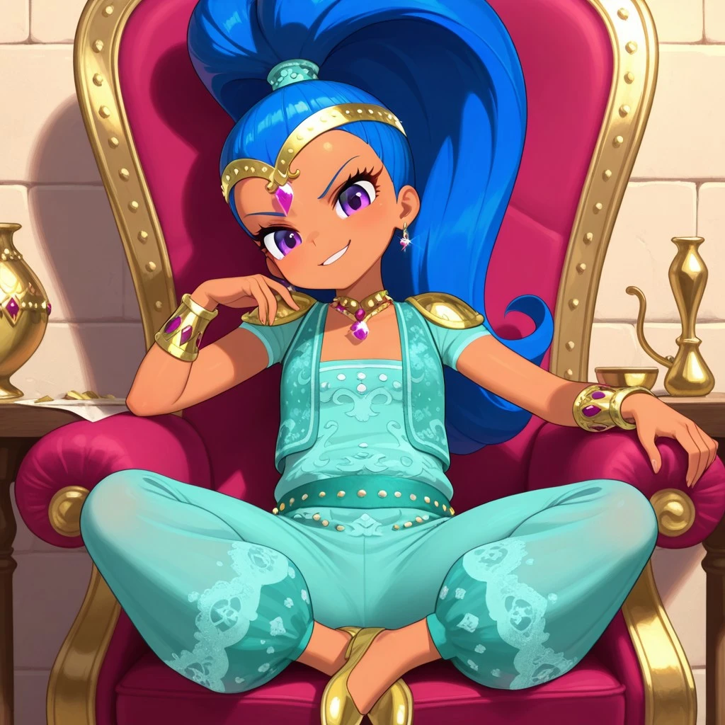 shine_ss, dark_skin, blue_hair, long hair, ponytail, purple eyes, earrings, necklace, arabian clothes, forehead jewel