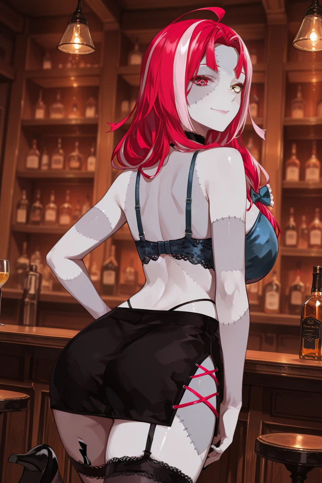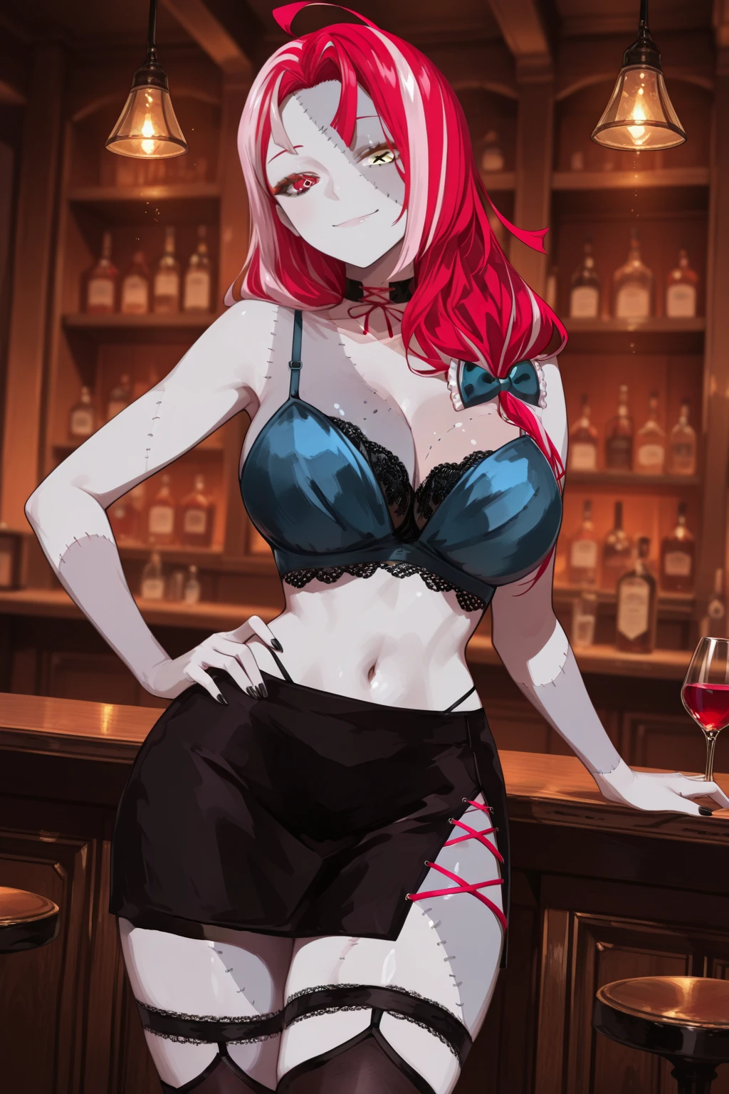 Appearance: holo_sallie, 1girl, grey skin, patchwork skin, stitches, zombie, red hair, pink hair, streaked hair, multicolored hair, long hair, stitched face, heterochromia, red eye, yellow eye, mismatched pupils, x-shaped pupils, diamond-shaped pupils, black choker, ahoge, hair bow, blue bow, large breasts, black nails