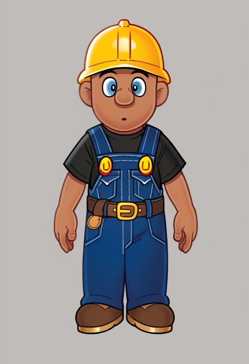 Brooklyn_T_Guy_Jr, blue eyes, shirt, 1boy, hat, short sleeves, belt, black shirt, overalls, yellow headwear, blue overalls, hard hat, construction worker, semi dark skin, bald, brown shoes