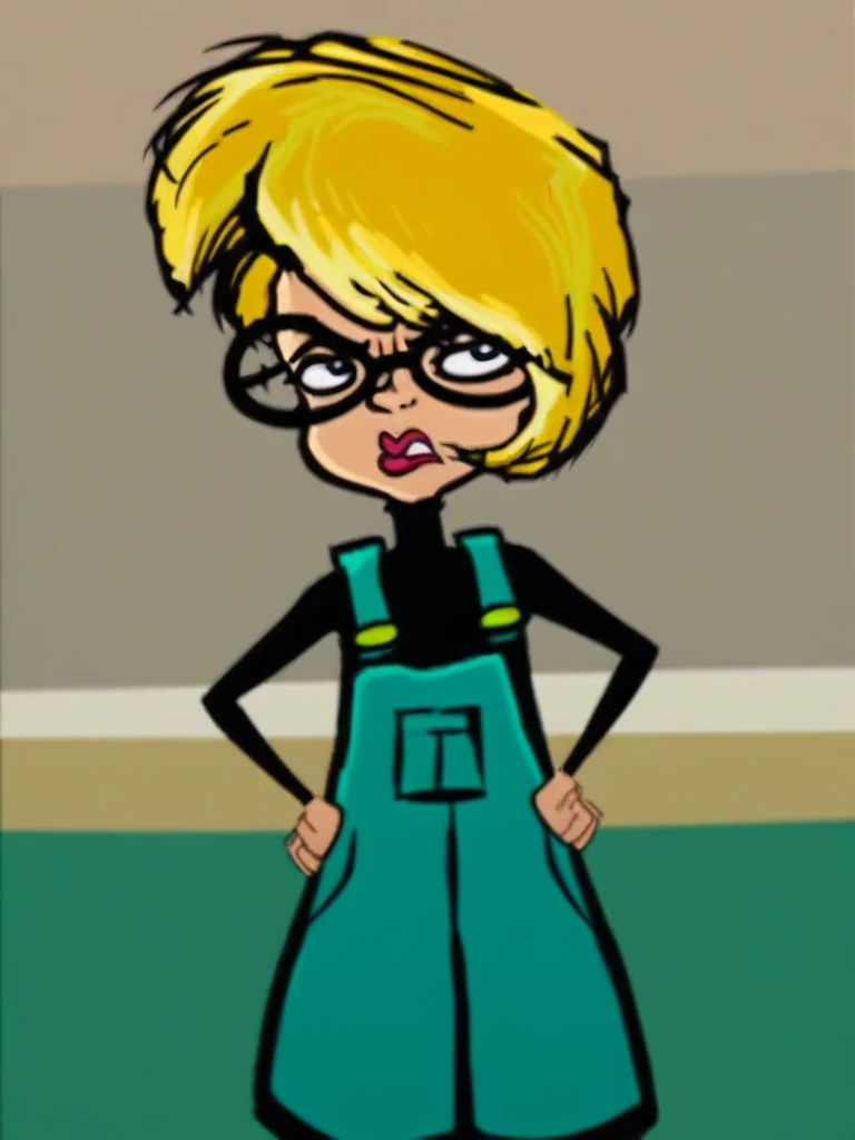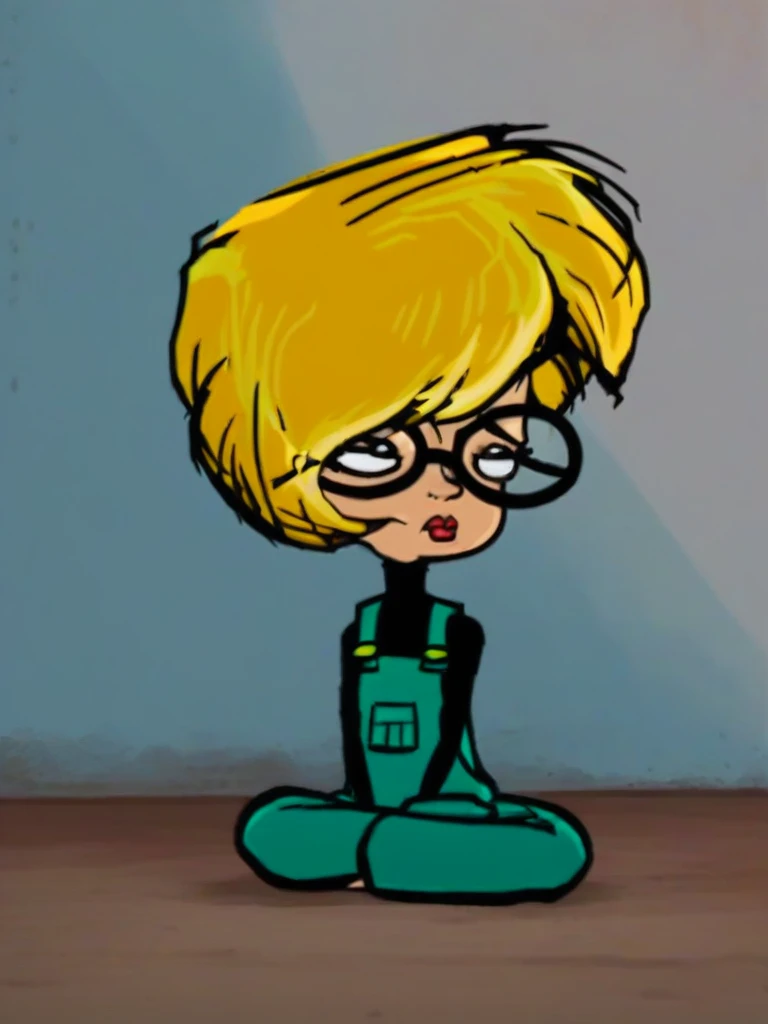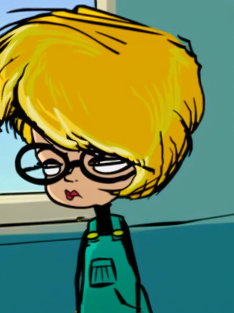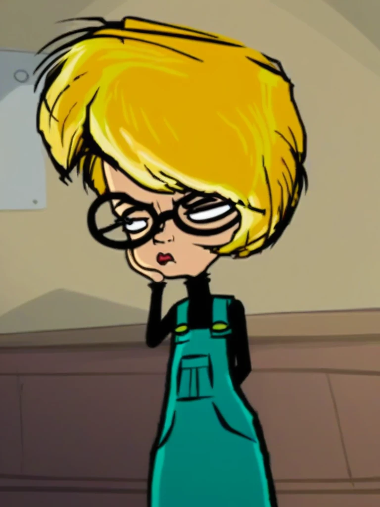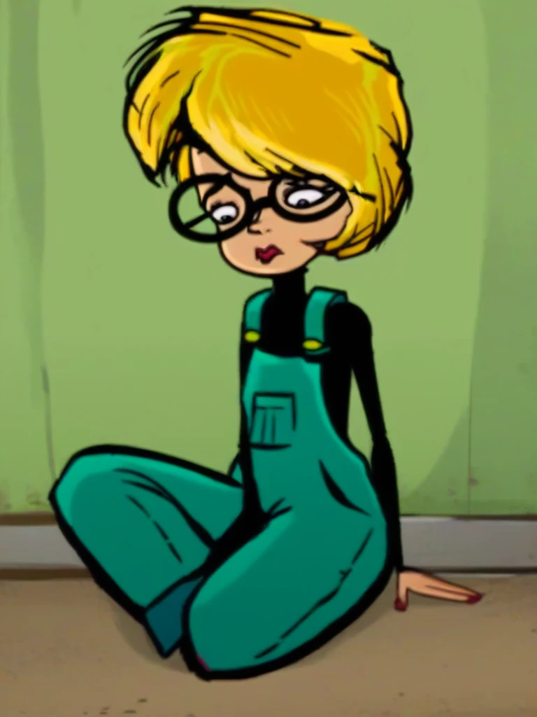 blonde hair, short hair, glasses, overalls, black shirt, lipstick,