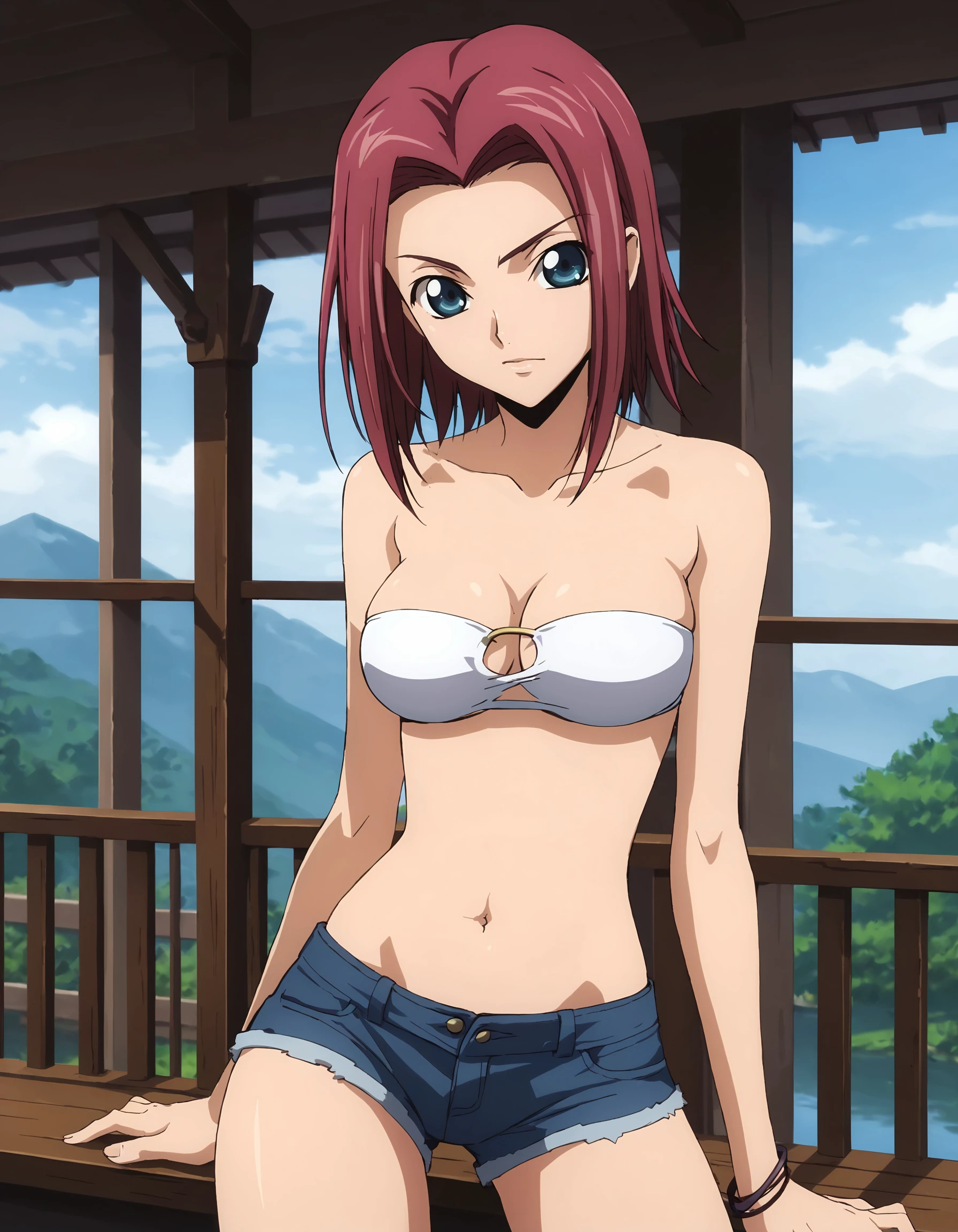 Pilot Suit - turtleneck shirt, ribbed shirt, sleeveless shirt, red shirt, navel cutout, navel, detached sleeves, white sleeves, white belt, brown shorts, red thighhighs