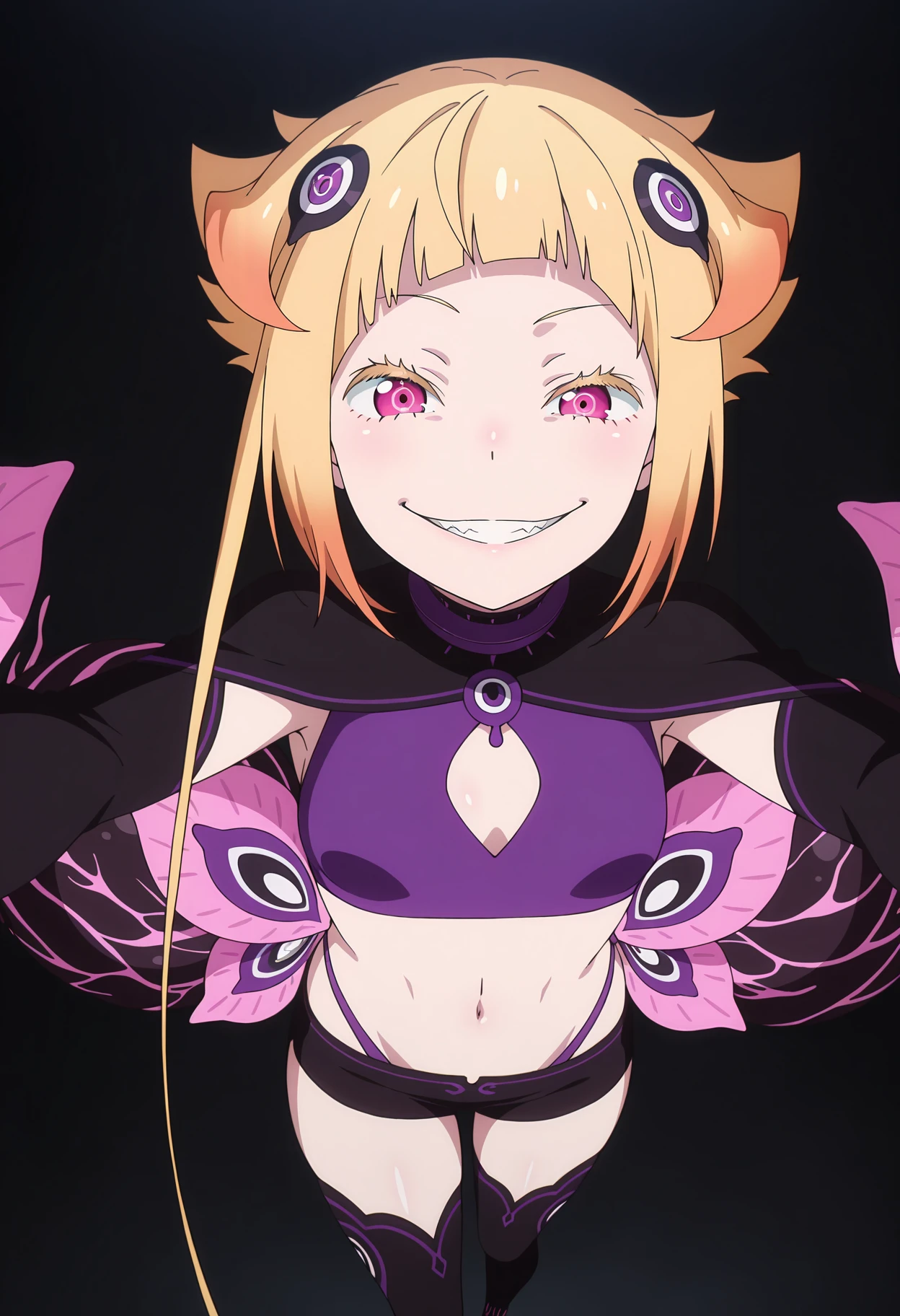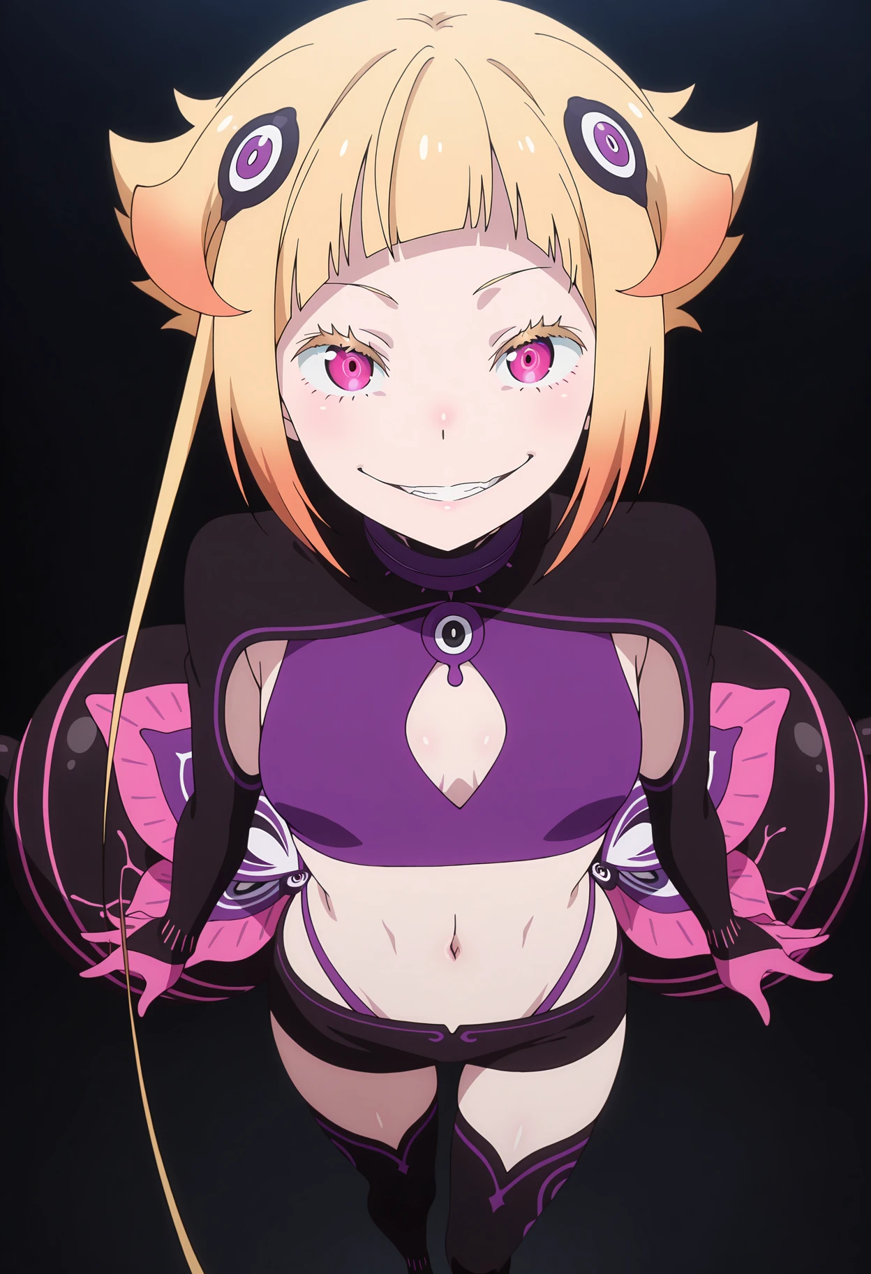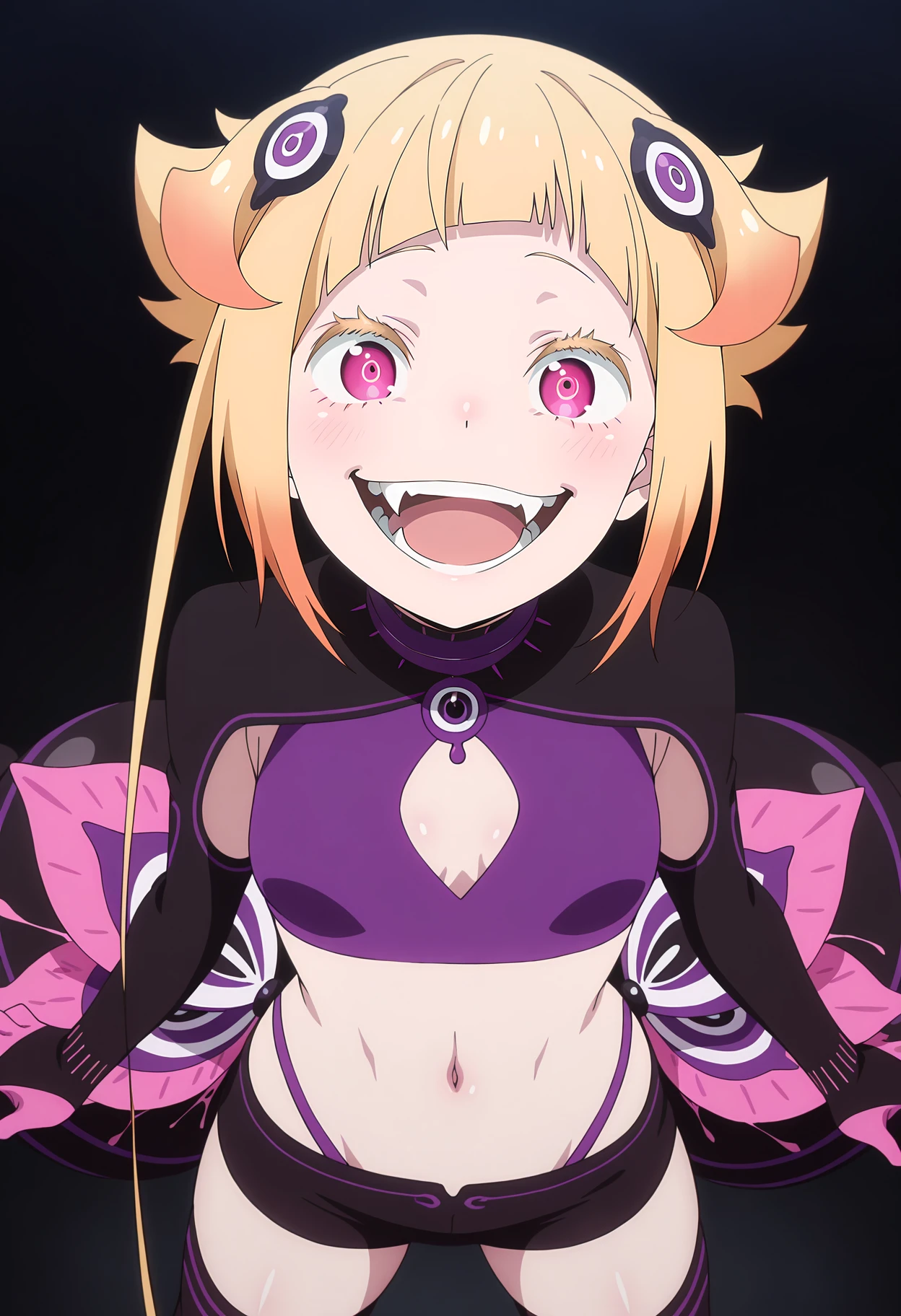 monster girl, purple choker, shrug \(clothing\), long sleeves, black sleeves, crop top, purple shirt, cleavage cutout, small breasts, navel, pink gloves, highleg panties, short shorts, black shorts, black thighhighs