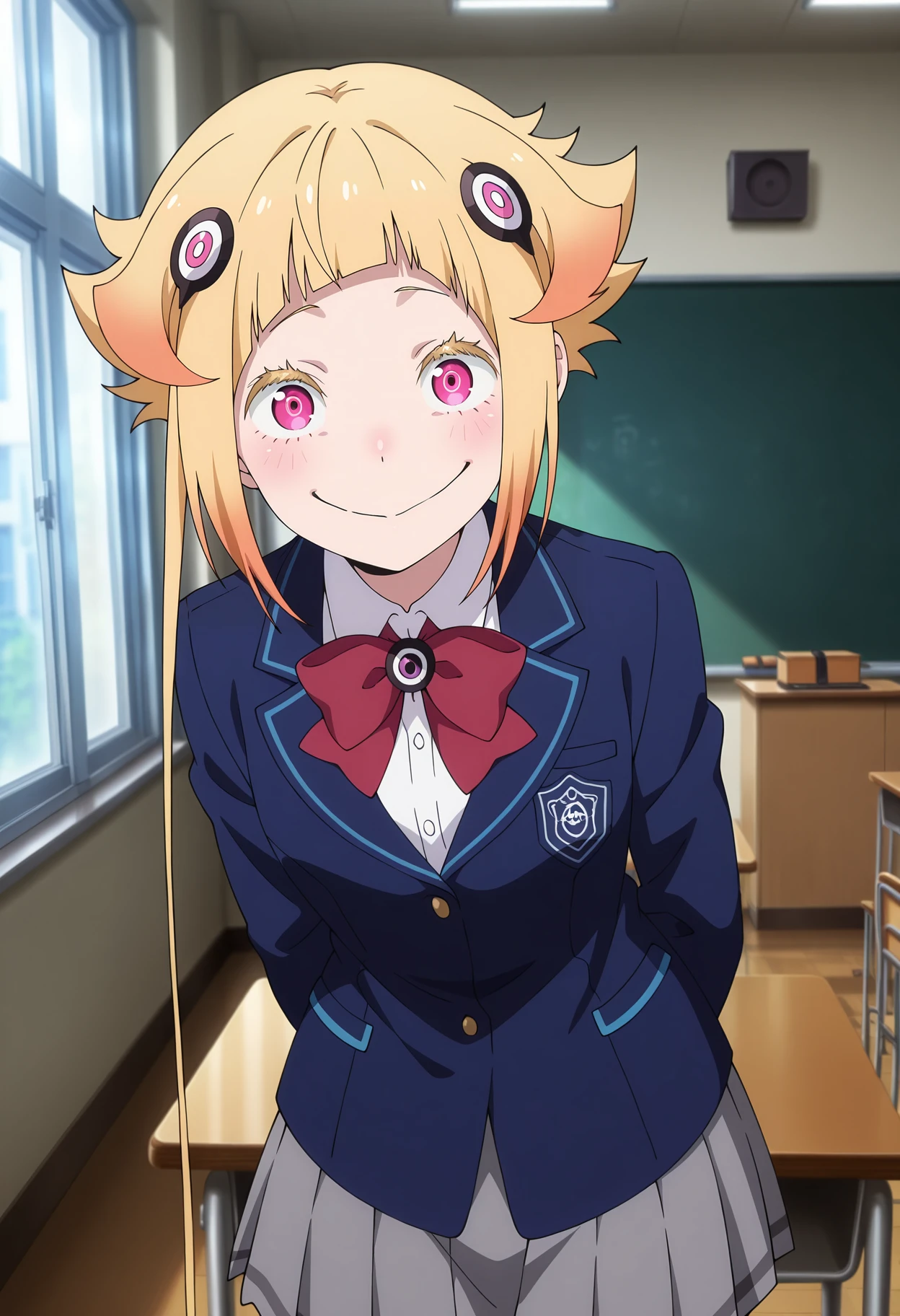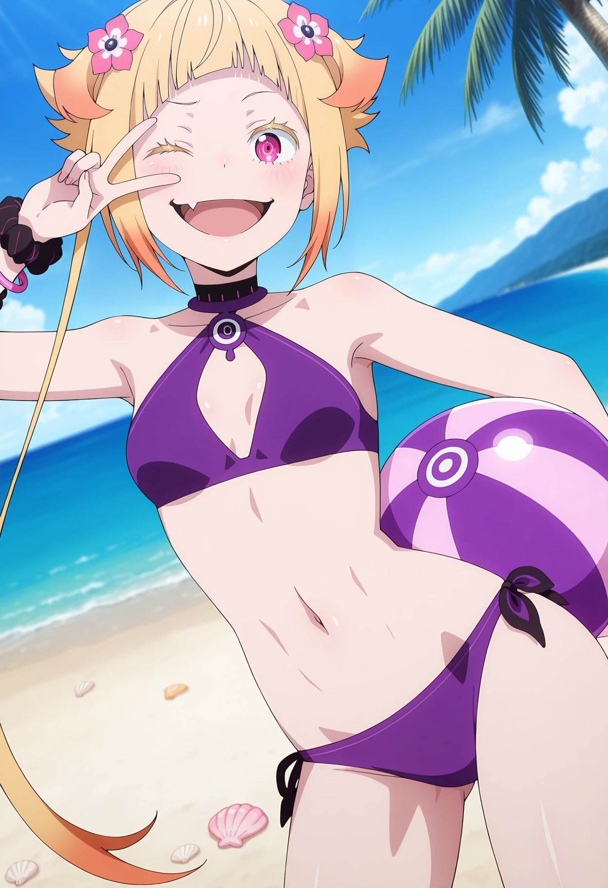 blunt bangs, short hair with long locks, gradient hair, blonde hair, orange hair, colored eyelashes, pink eyes, hair ornament