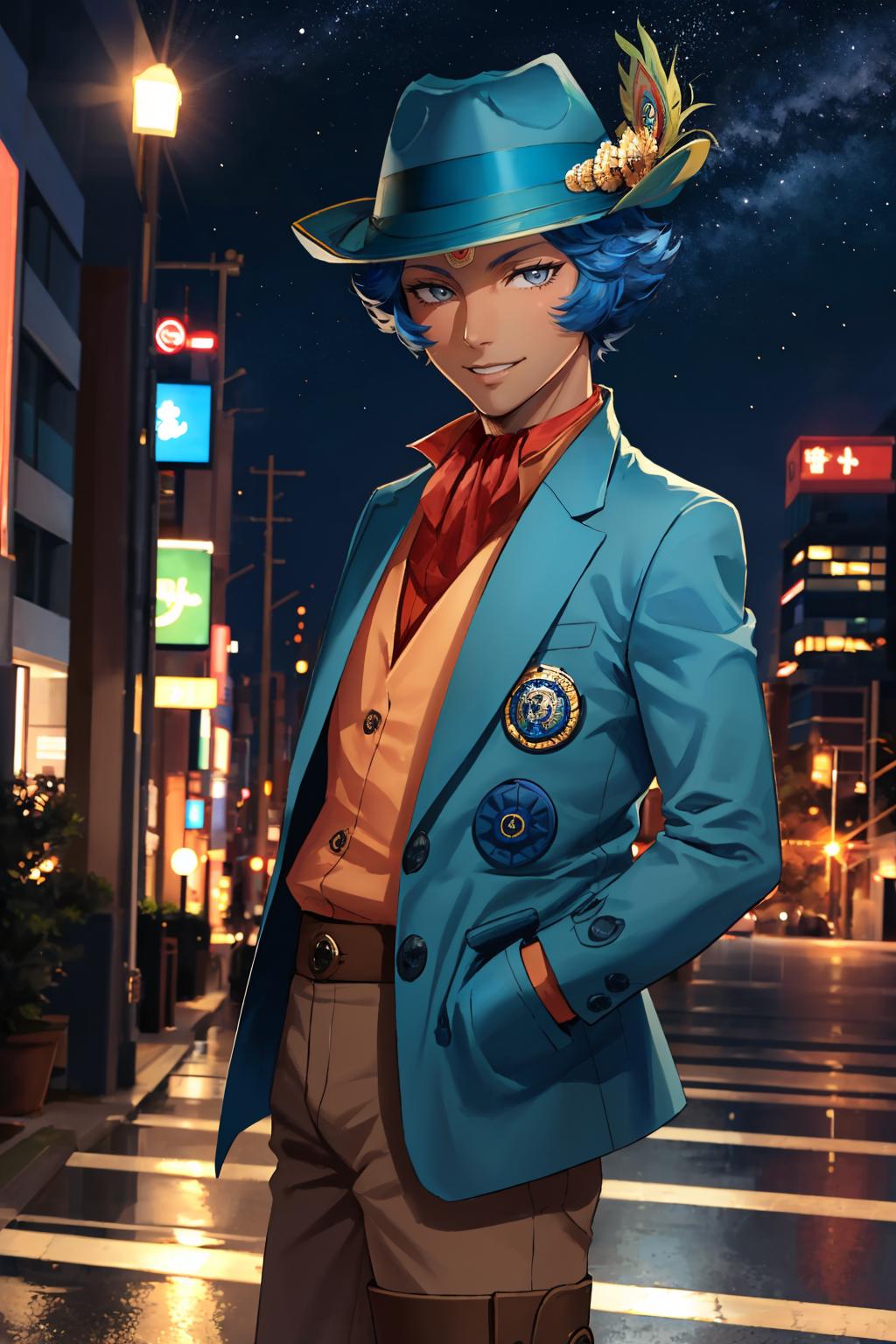 Tags: krishnasmt, hat, dark-skinned male, blue hair, jacket, shorts, boots