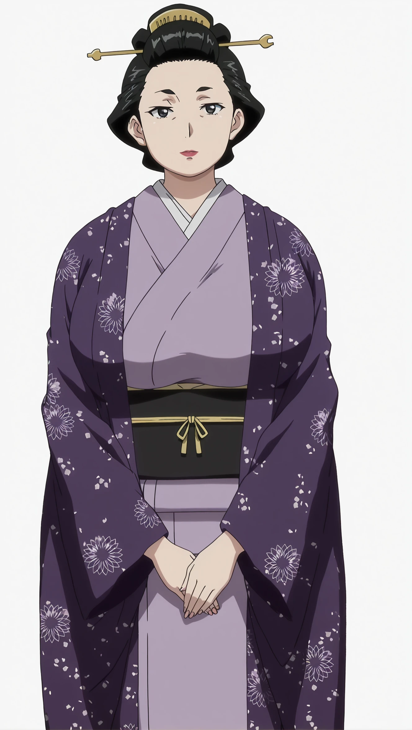 omitsutomioka, 1girl, mature female, short hair, half updo, black hair, black eyes, big breasts, kimono, japanese clothes, hair ornament, hair stick, purple kimono, sash, obi, solo, pose, standing, looking at viewer, white background, simple background, anime coloring, anime screencap, masterpiece, best quality, amazing quality, intricate details, uncensoredDescription