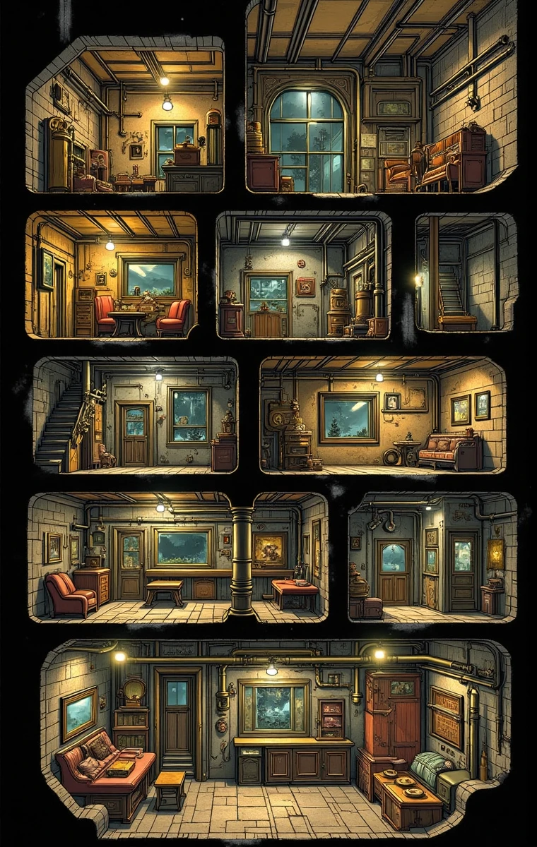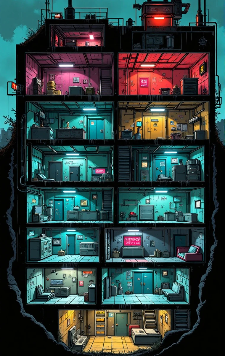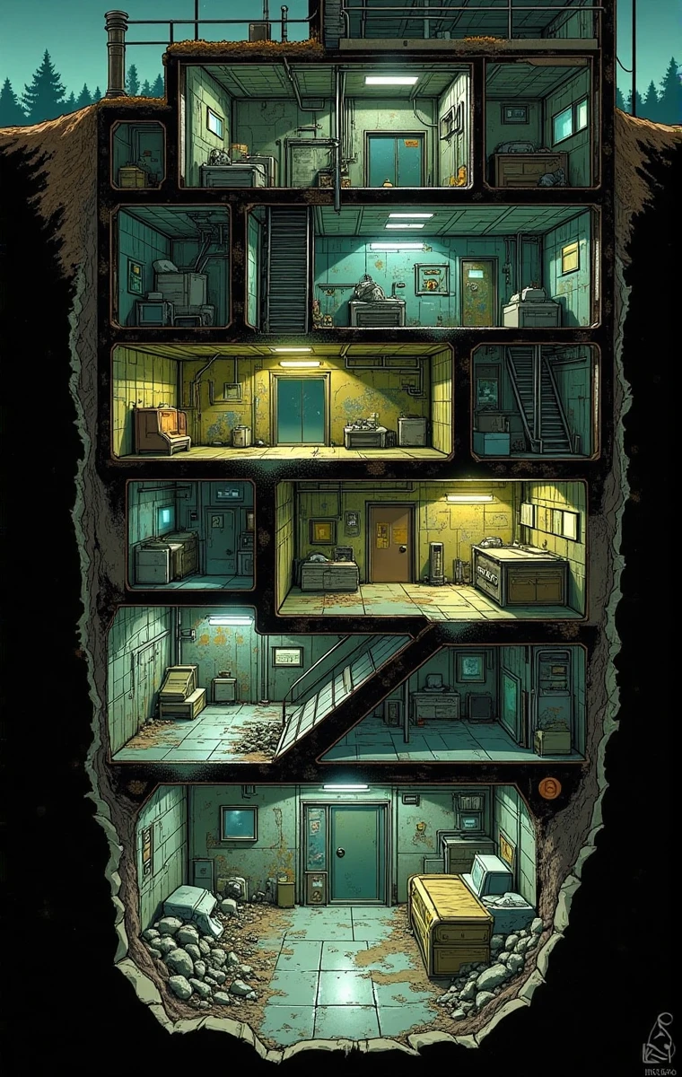 Cross - section view of buildings, industrial factory underground, pipes and gears, yellow - orange tones, machinery in each level, dusty atmosphere.