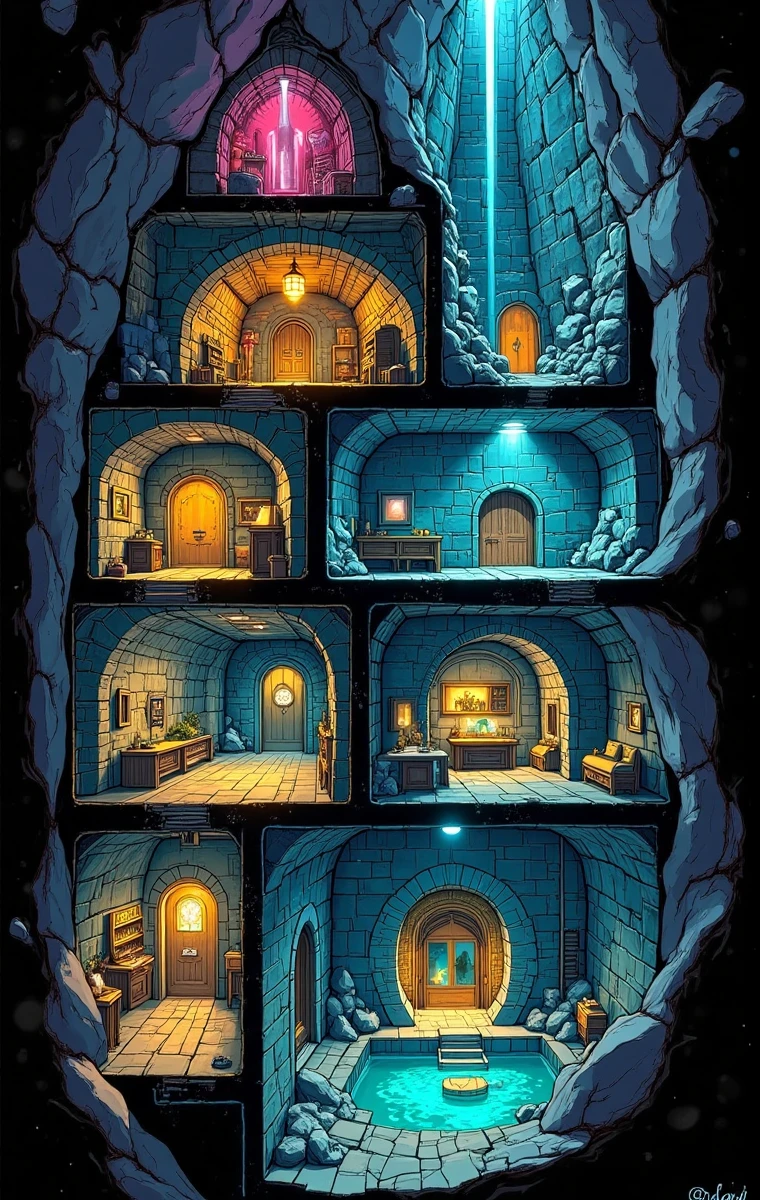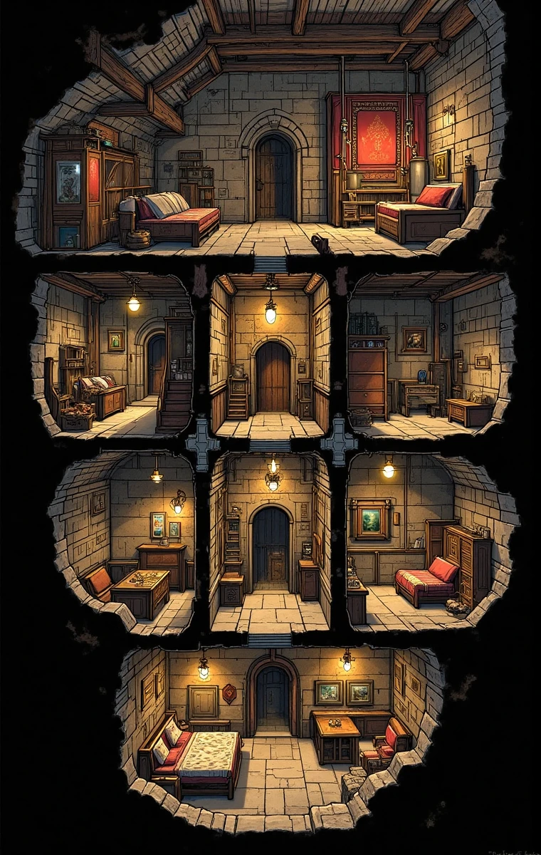 Cross - section view of buildings, medieval castle interior, stone walls, torch - lit halls, spiral staircases, dungeon below, warm lighting.
