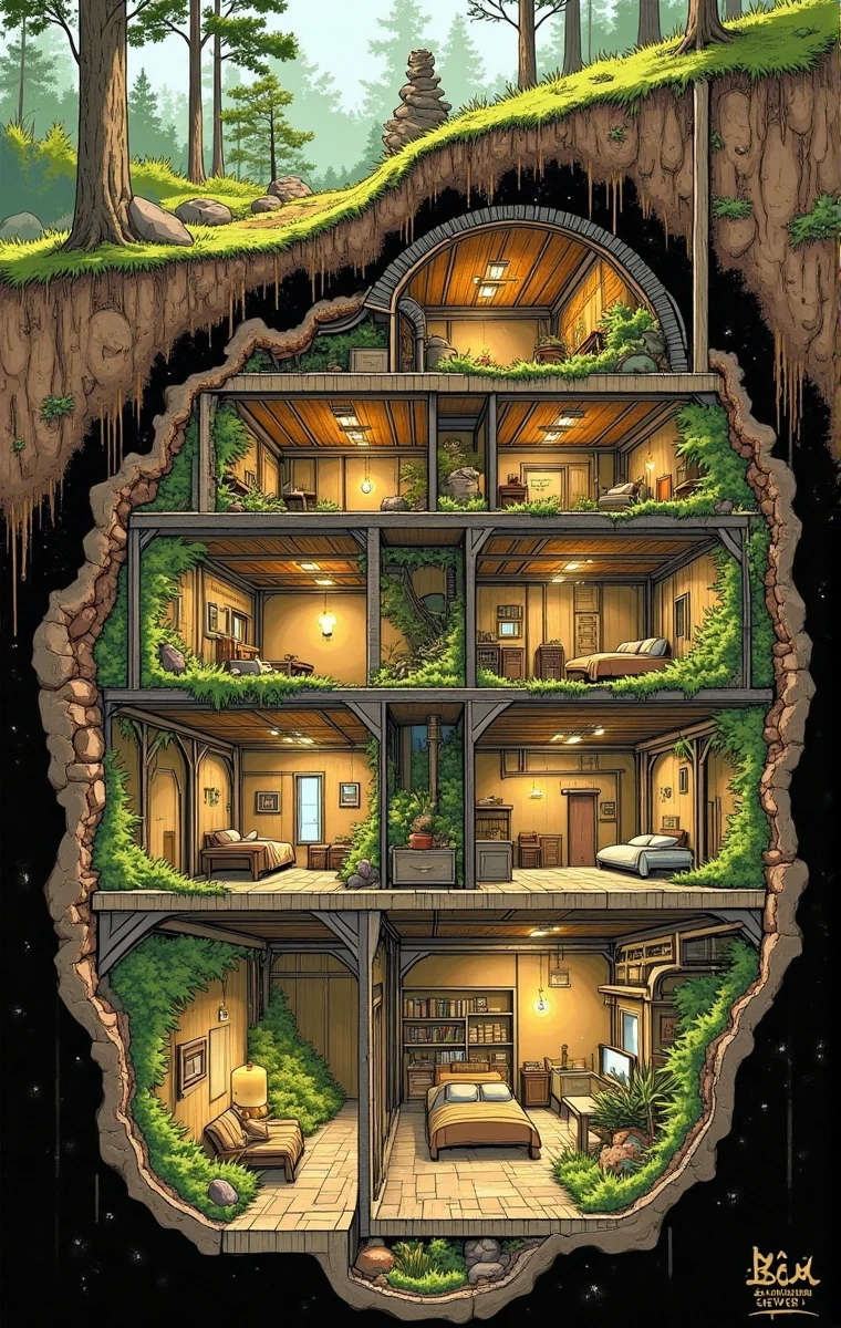 Cross - section view of buildings, cozy forest burrow, wooden interiors, nature - themed decor, sunlight filtering in, green foliage around.