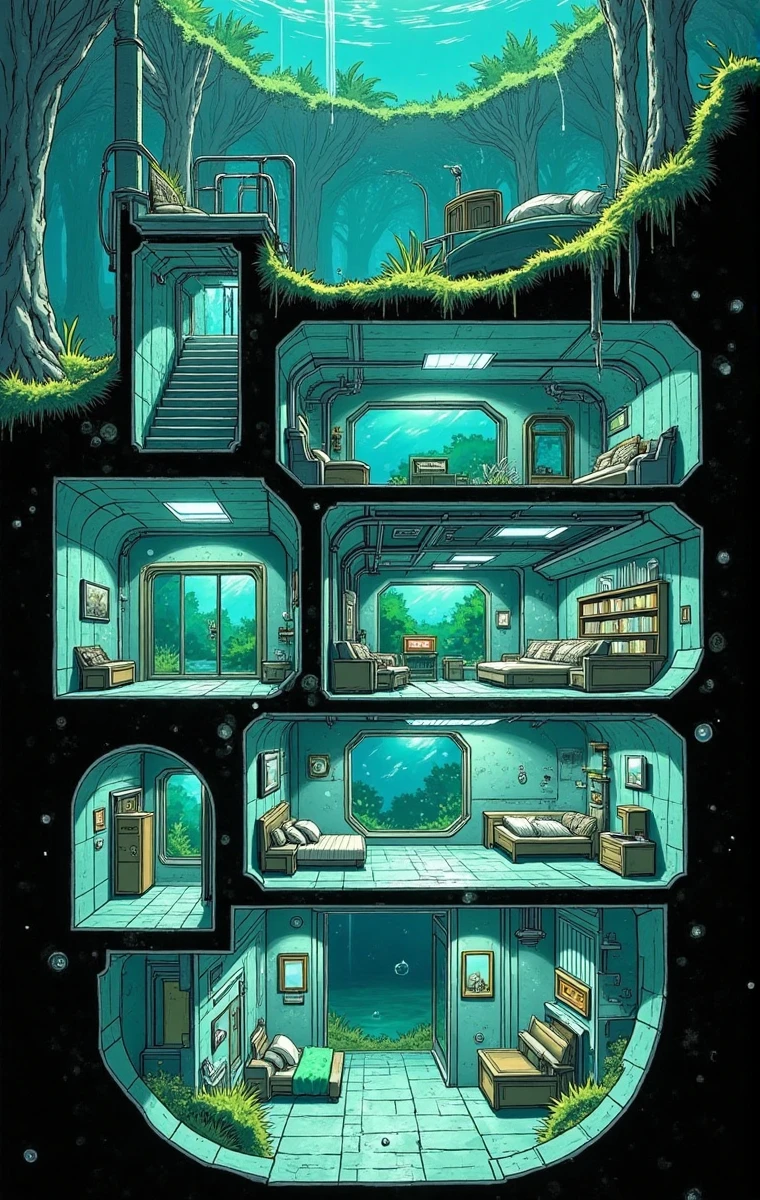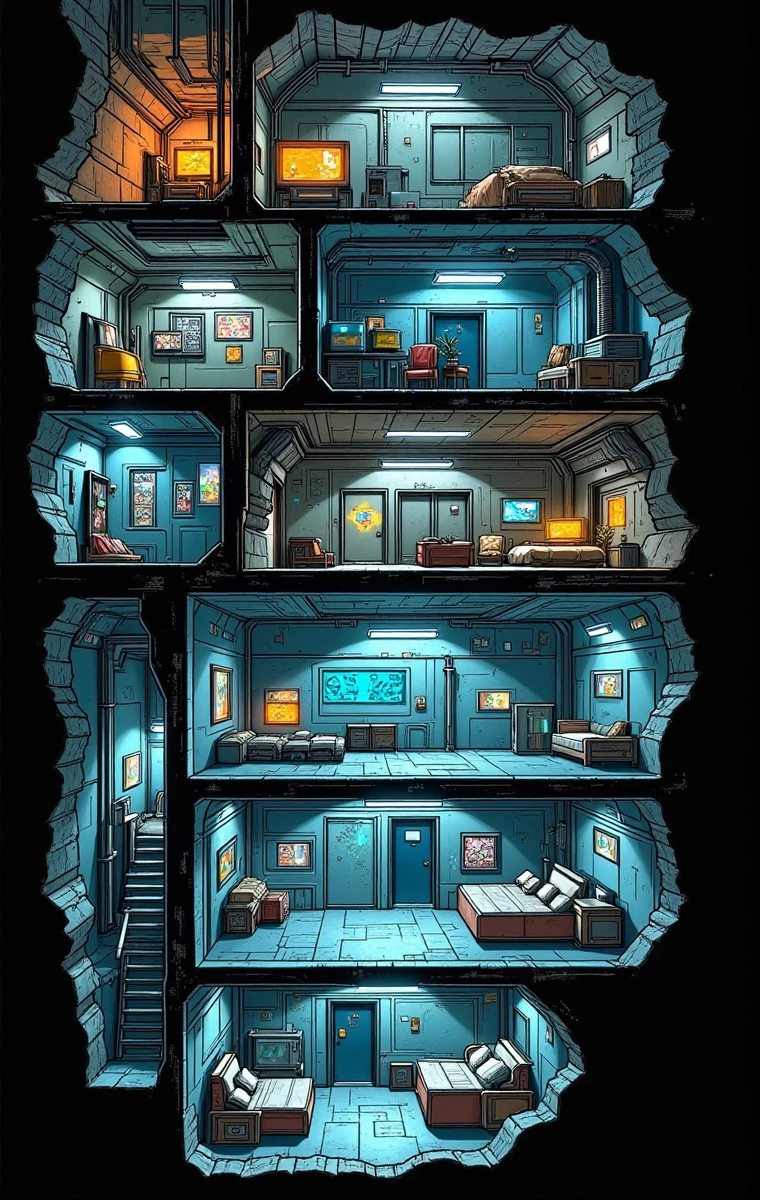 Cross - section view of buildings, underground base on the moon, metal walls, glowing control panels, lunar landscape outside, sci - fi tech details.