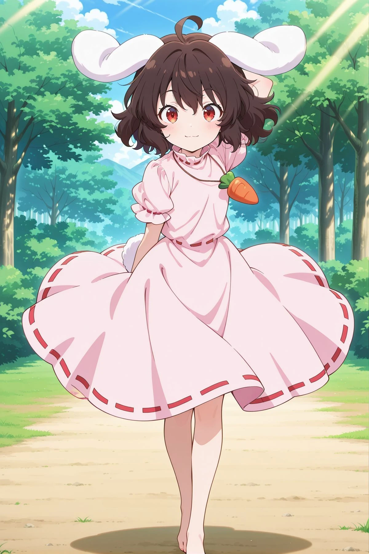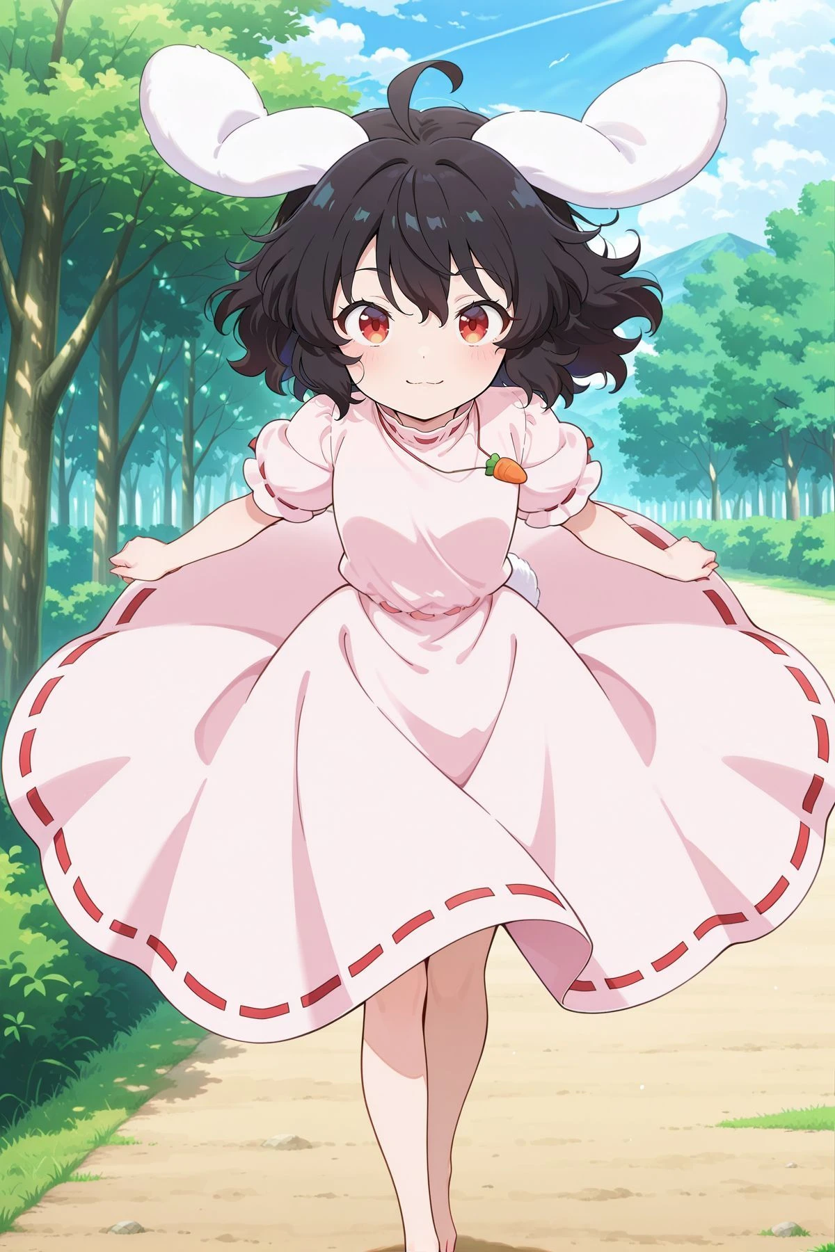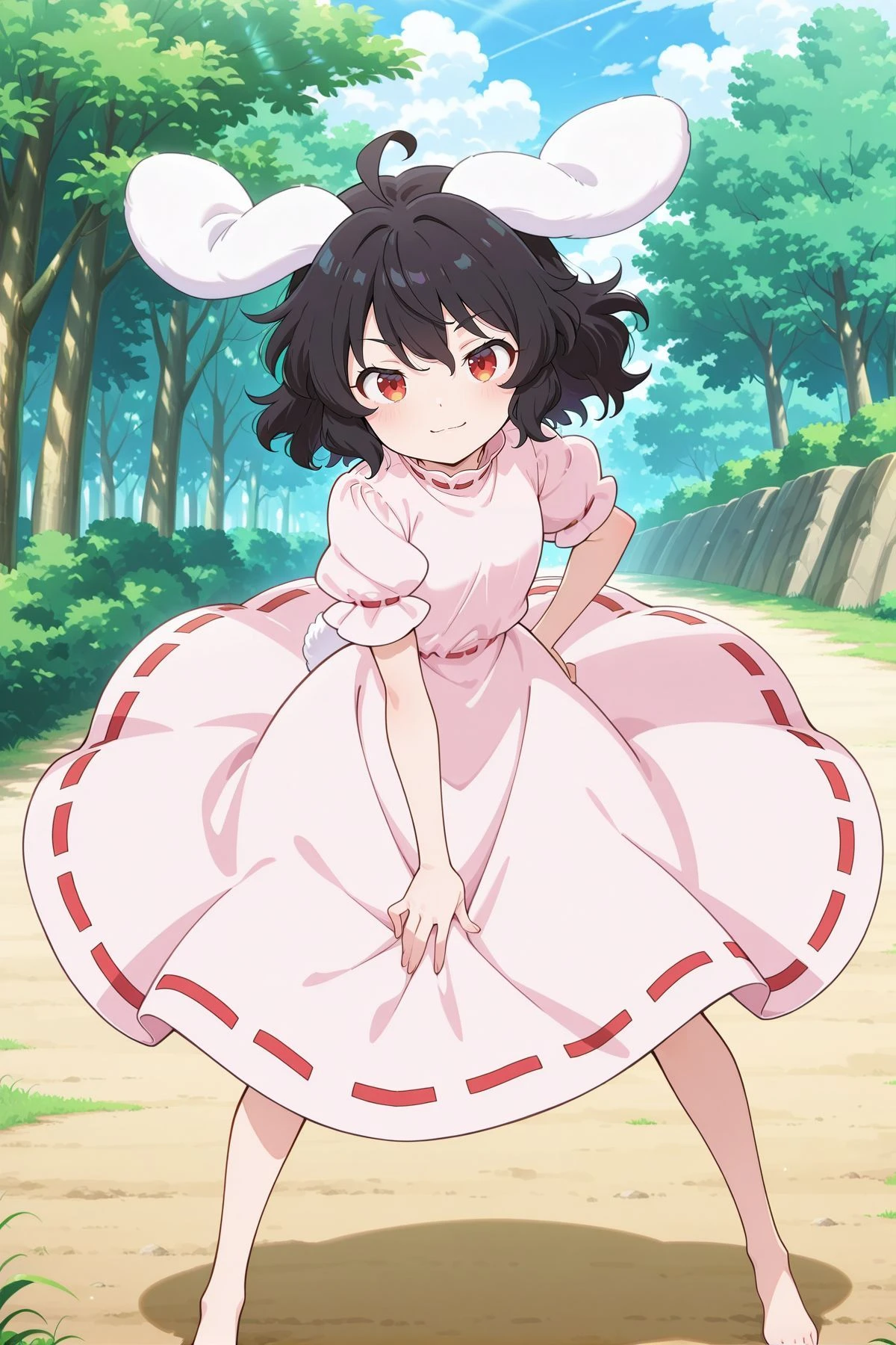 inaba tewi, 1girl, solo, red eyes, black hair, medium hair, wavy hair, ahoge, rabbit ears, floppy ears, rabbit tail,, inaba tewi \(eternal\), adapted costume, light pink dress, circle skirt, puffy short sleeves, ribbon-trimmed dress, barefoot,