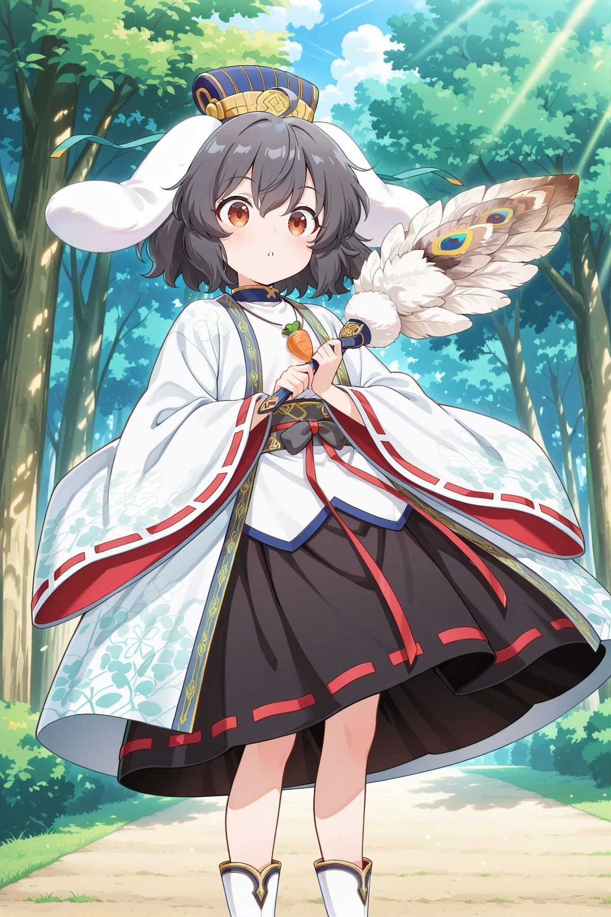 inaba tewi, 1girl, solo, brown eyes, grey hair, hair between eyes, rabbit ears, floppy ears,, inaba tewi \(bunny rebellion strategist\), alternate costume, blue hat, dianzi, carrot necklace, white haori, long sleeves, wide sleevs, white shirt, grey obi, black skirt, ribbon-trimmed skirt, white boots, holding feather fan,