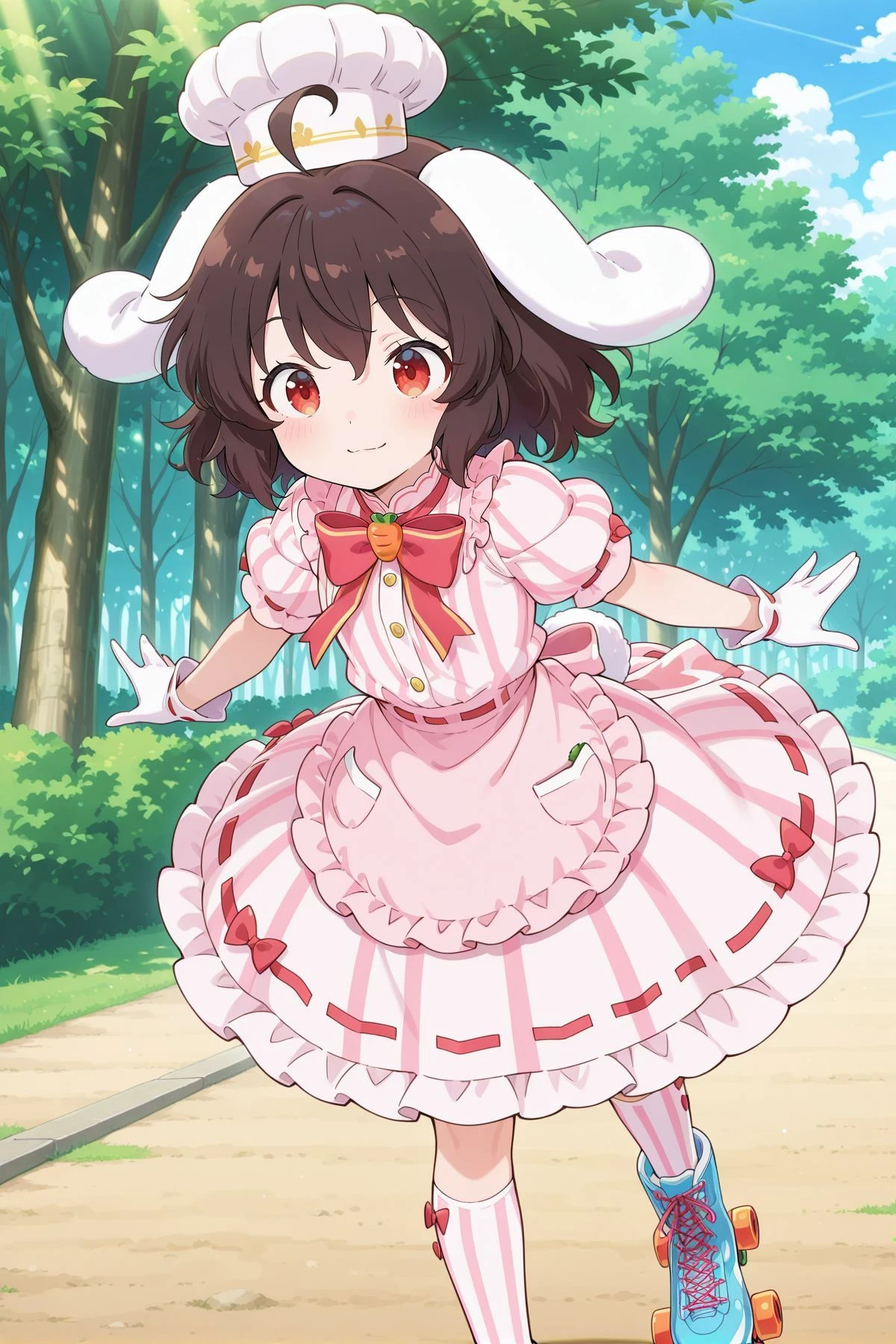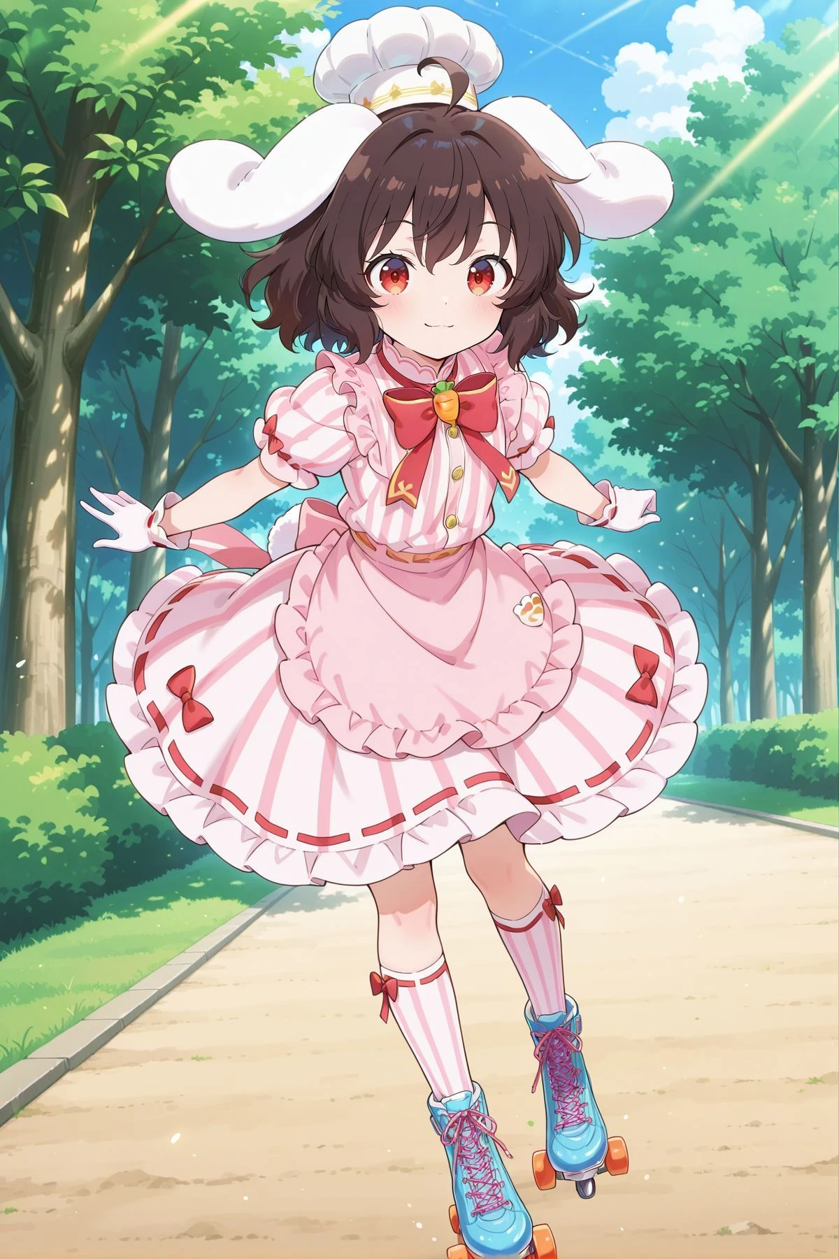 inaba tewi, 1girl, solo, red eyes, brown hair, medium hair, ahoge, rabbit ears, floppy ears, rabbit tail,, inaba tewi \(happy patissiere\), alternate costume, white hat, chef hat, red bowtie, carrot brooch, pink shirt, vertical-striped shirt, buttons, puffy short sleeves, white gloves, multicolored waist ribbon, waist apron, pink apron, frilled apron, ribbon-trimmed apron, frilled skirt, ribbon-trimmed skirt, vertical-striped skirt, skirt bow, white kneehighs, vertical-striped kneehighs, kneehighs bows, blue shoes, roller skates,