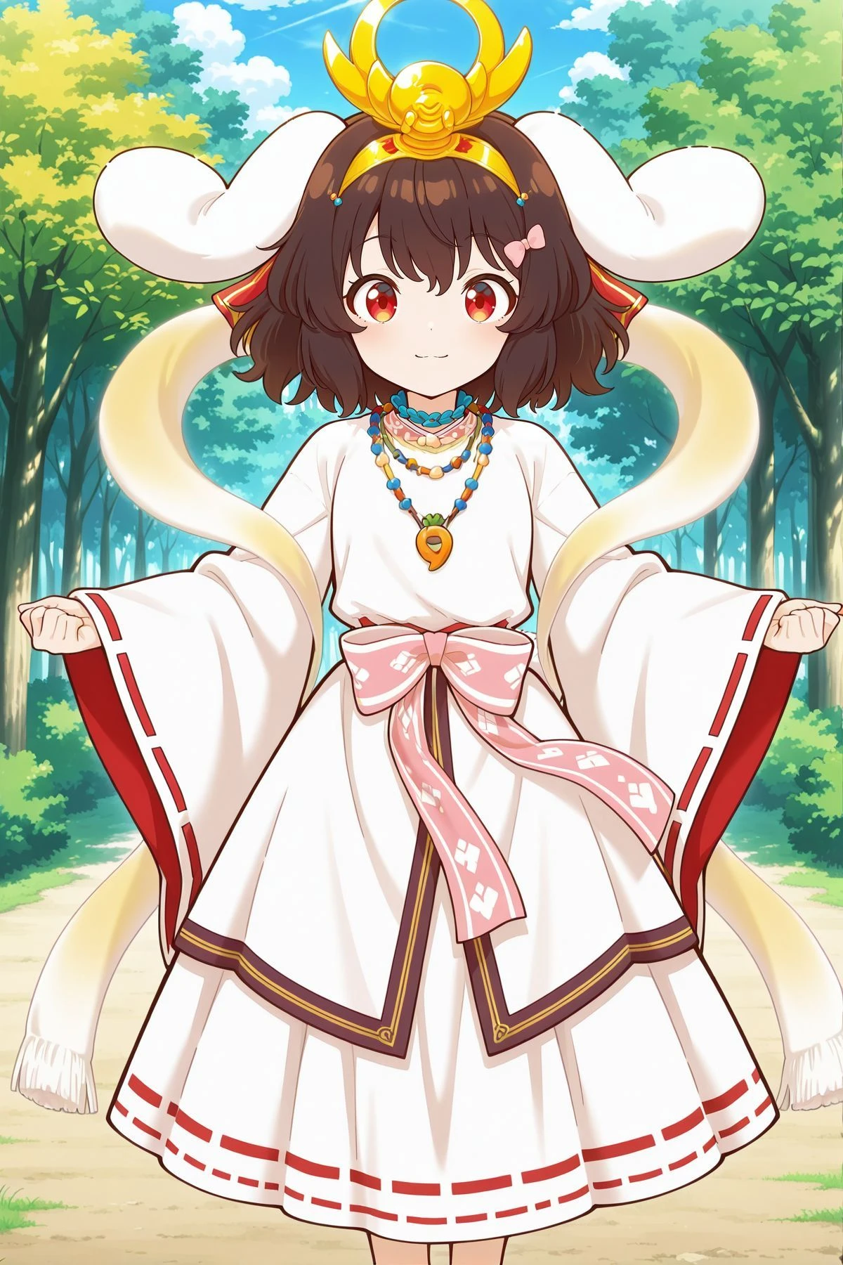 inaba tewi, 1girl, solo, red eyes, brown  hair, short hair, rabbit ears, floppy ears, rabit tail,, inaba tewi \(white earth rabbit\), alternate costume, hair ornament, gold tiara, miko crown,dress bow, pink bow, magatama necklace, tassel, white dress, white skirt, white kimono, ribbon-trimmed sleeves, long sleeves, wide sleeves,