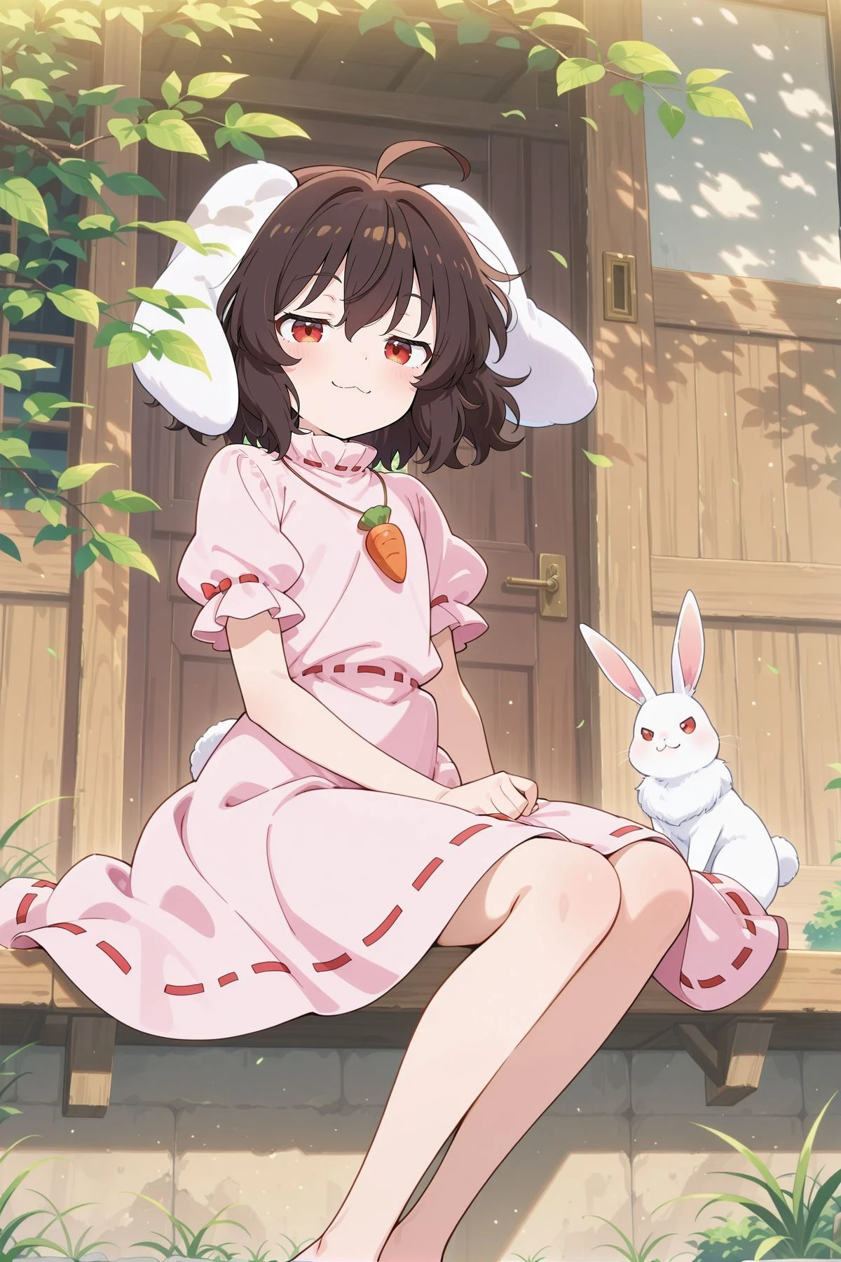 inaba tewi, 1girl, solo, red eyes, brown hair, medium hair, ahoge, rabbit ears, floppy ears, rabbit tail,