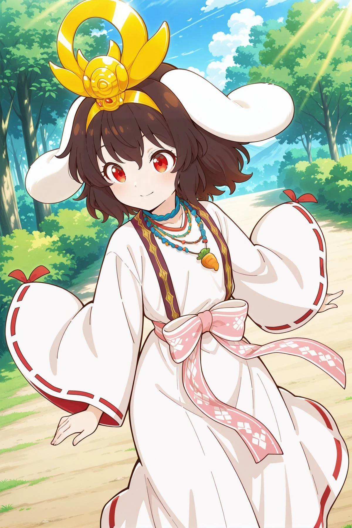 inaba tewi, 1girl, solo, red eyes, brown hair, rabbit ears, floppy ears, rabbit tail,, inaba tewi \(white earth rabbit\), alternate costume, hair ornament, gold kanmuri crown, gold hairband, hair bow, red bow, blue choker, bead choker, multiple necklaces, magatama necklace, bead necklace, white hagoromo, white kimono, long sleeves, wide sleeves, ribbon-trimmed sleeves, waist bow, pink bow, sash,