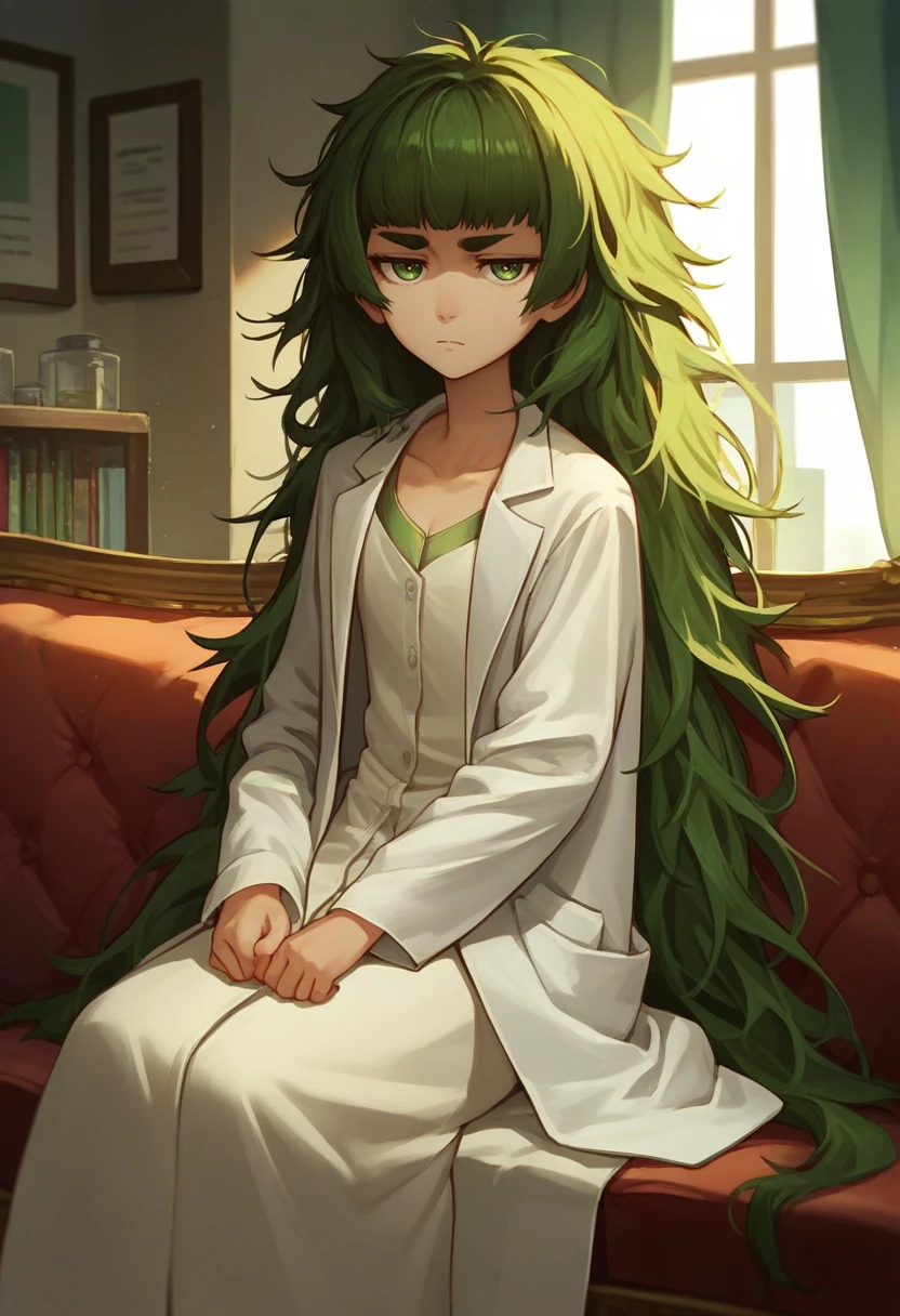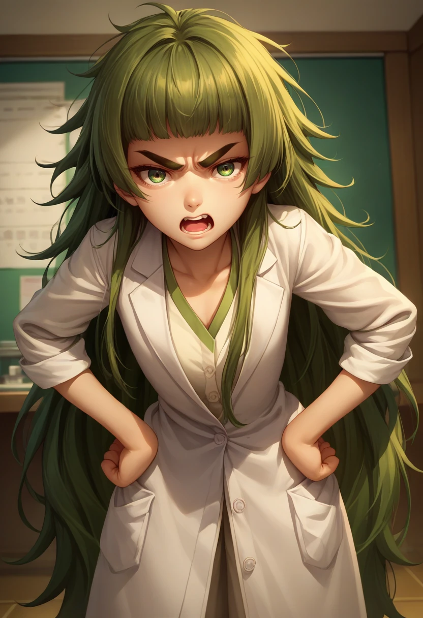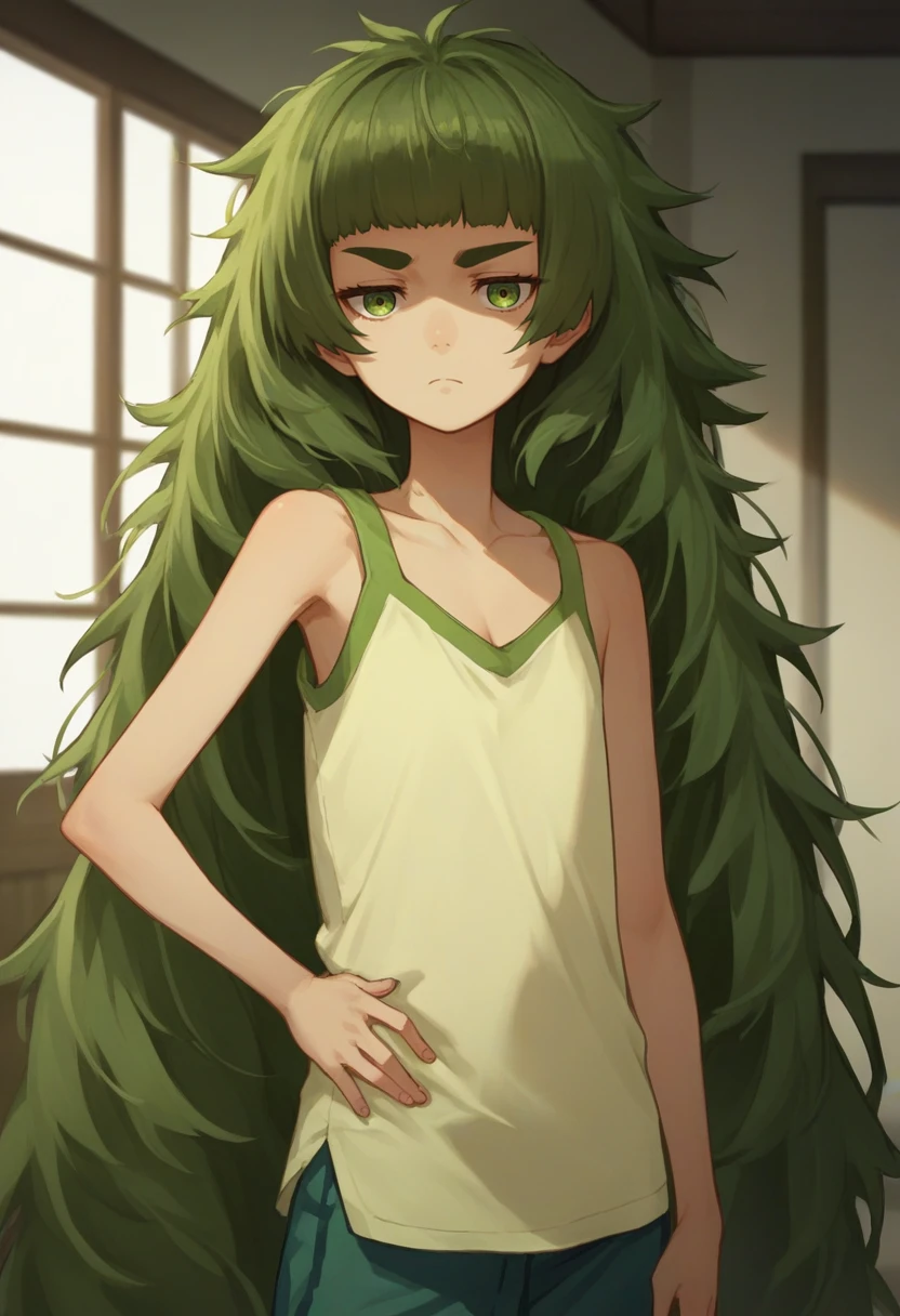 hiyajo maho, very long hair, green hair, messy hair, thick eyebrows