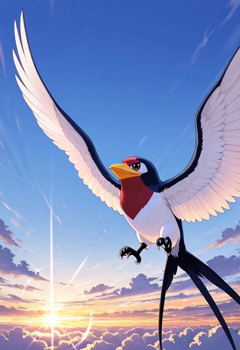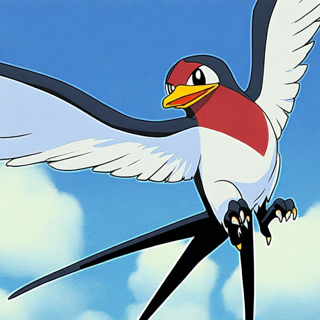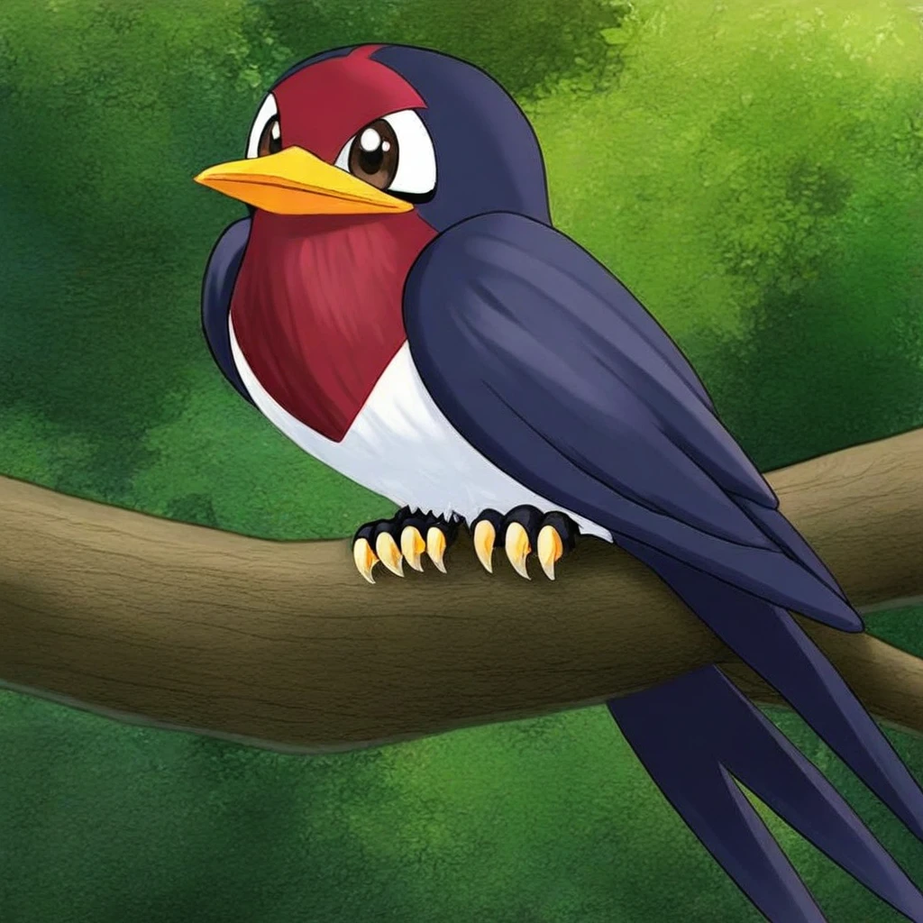 Taillow_pkmn, blue feathers, red feathers, white feathers, brown eyes, yellow beak, tailfeathers