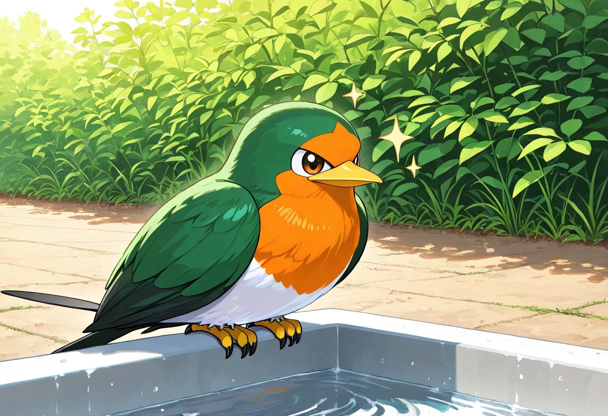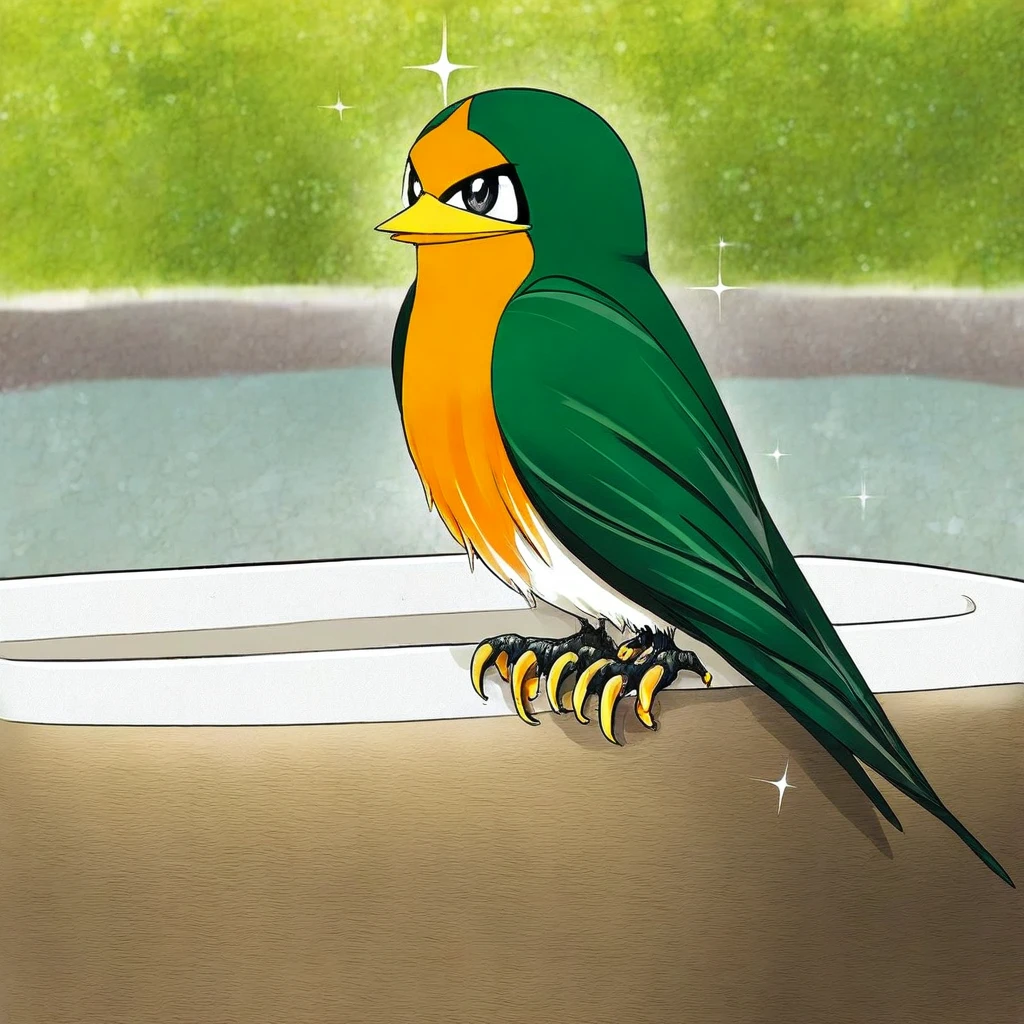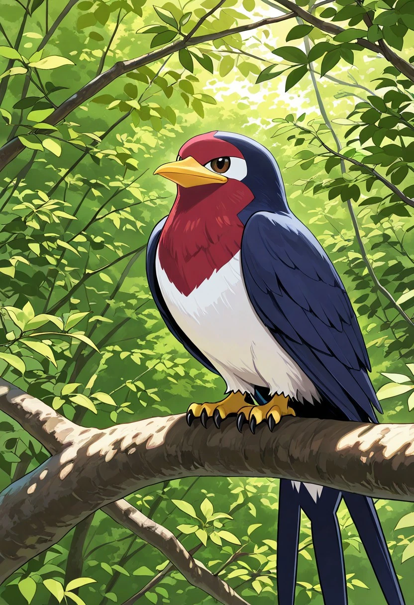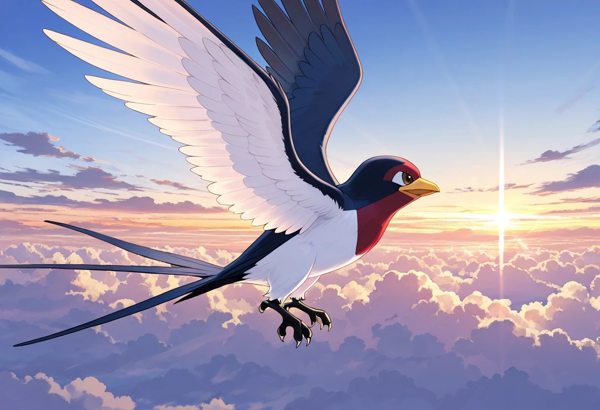 Taillow_pkmn, blue feathers, red feathers, white feathers, brown eyes, yellow beak, tailfeathers