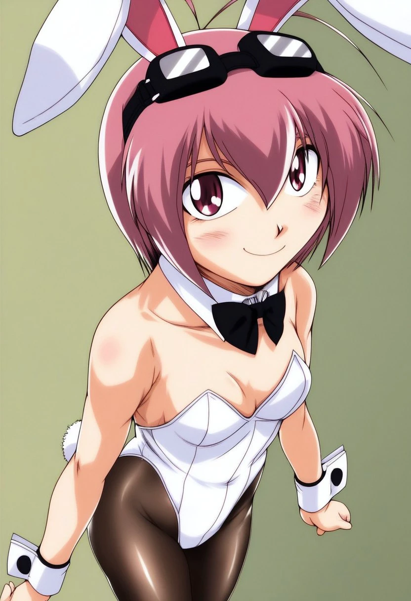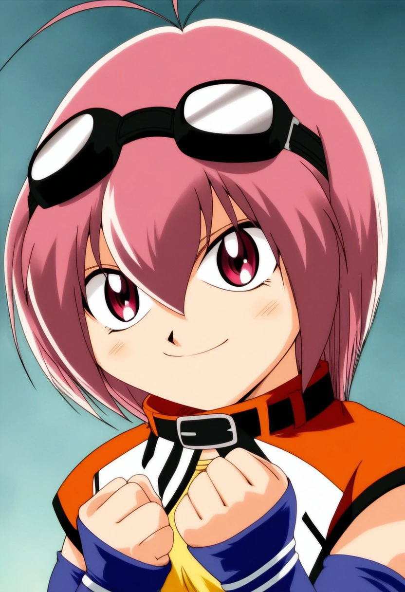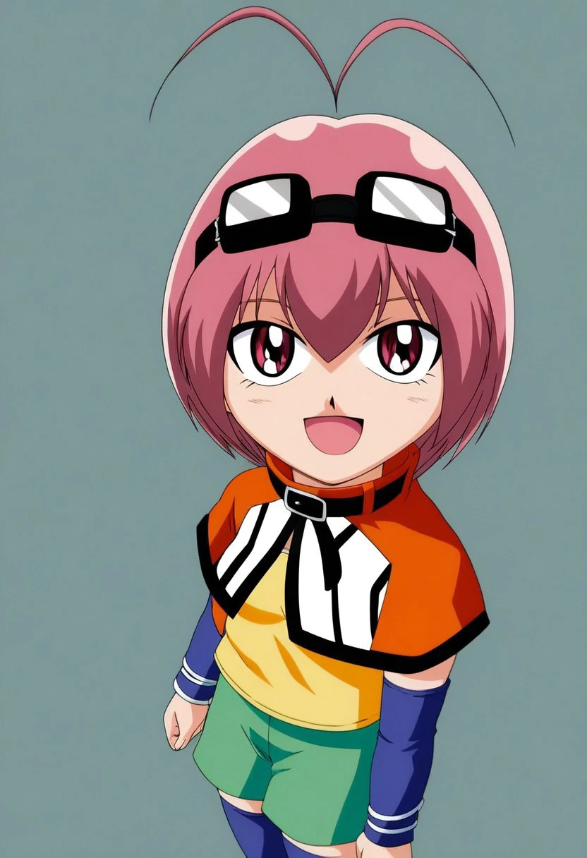 beyblade g-revolution, mathilda, 1girl, solo, thighhighs, goggles, goggles on head, short hair, shorts, antenna hair, pink hair, pink eyes, green shorts, cleavage cutout, cropped jacket, yellow shirt, blue thighhighs, ahoge
