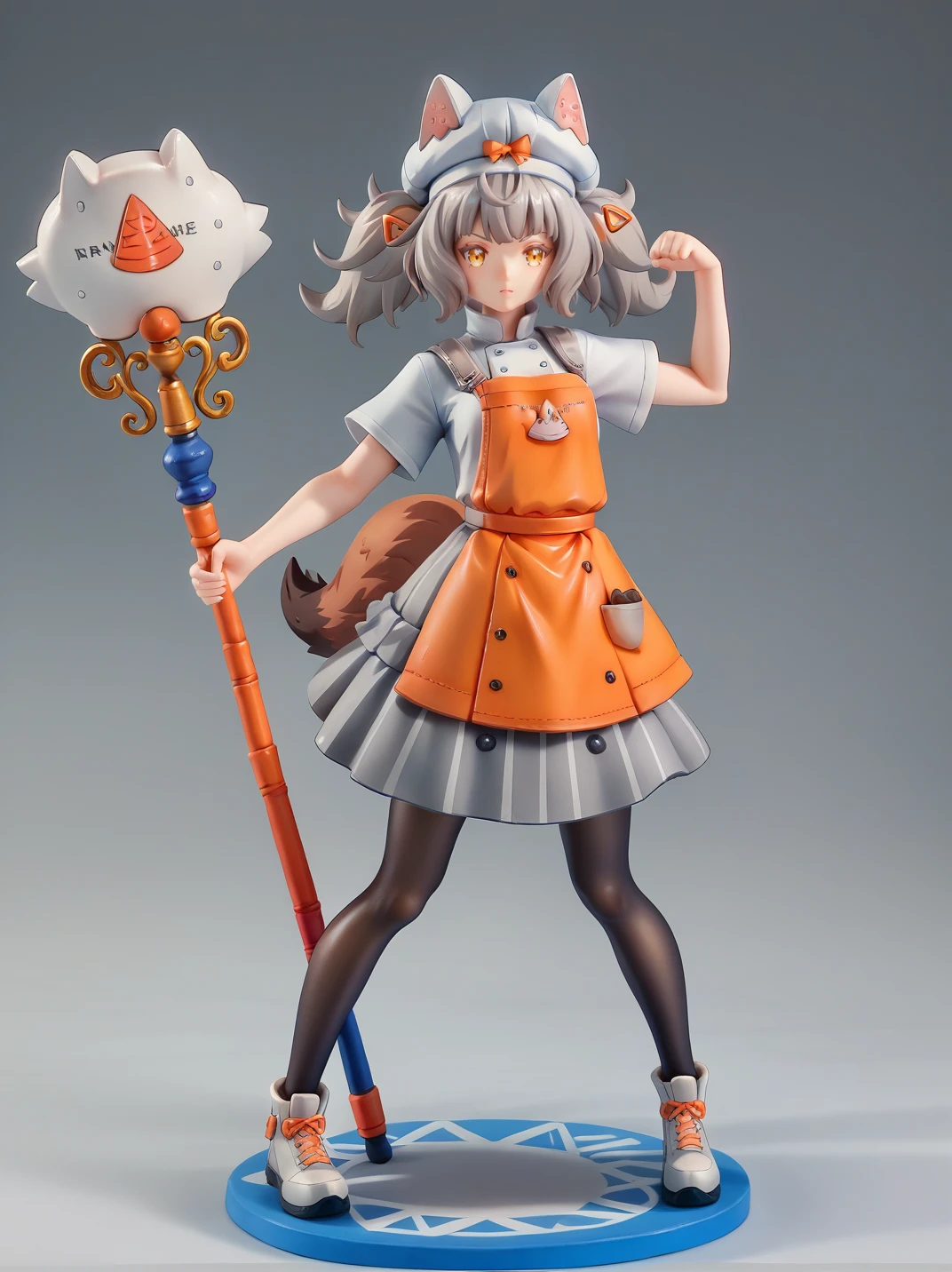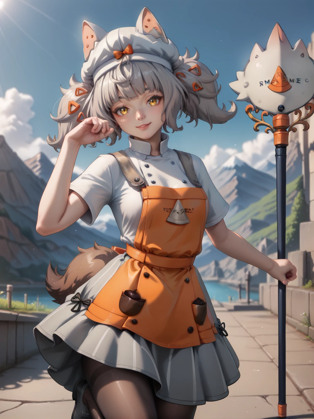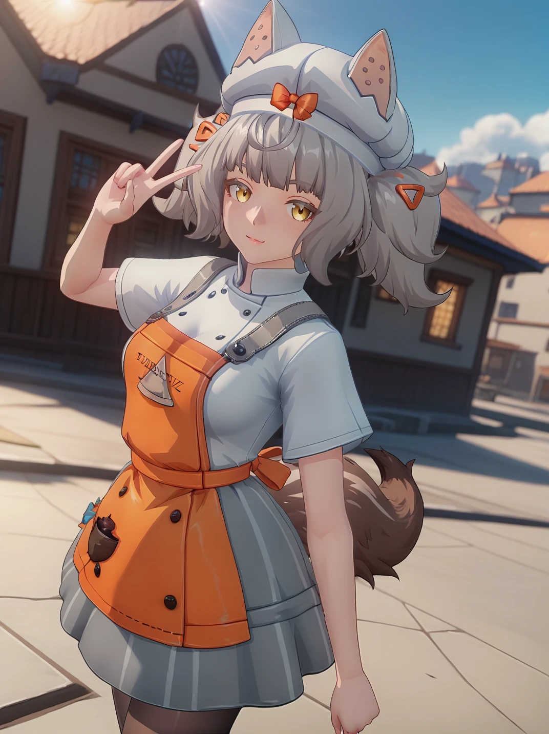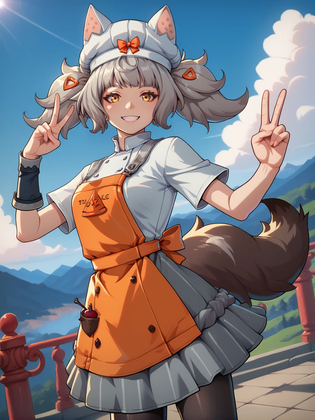 Outfit Prompts: "grey hair, yellow eyes, twintails, hair ornament, hat, single glove, white shirt, orange apron, pantyhose, grey skirt, animal ears, tail"