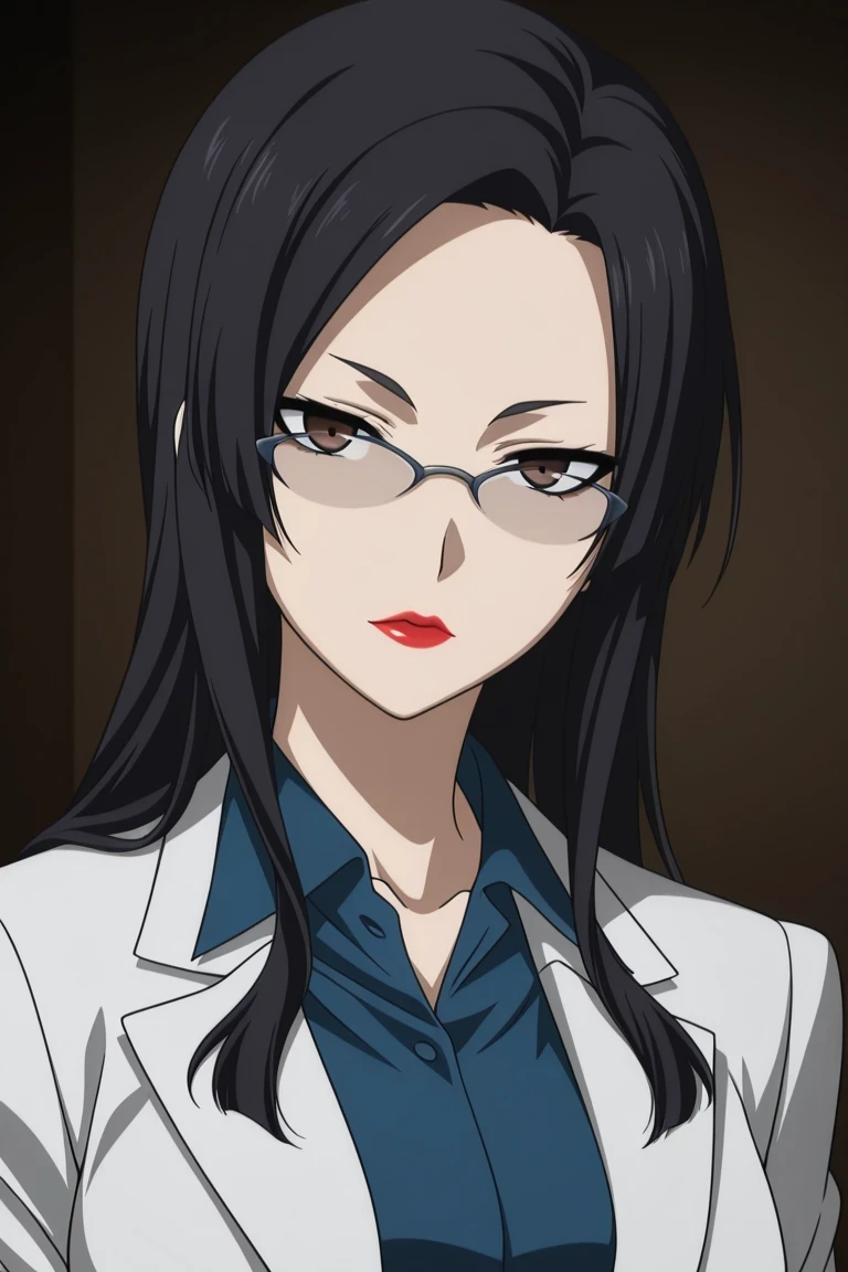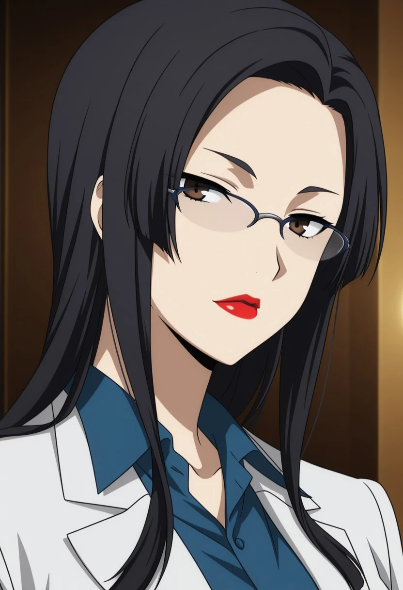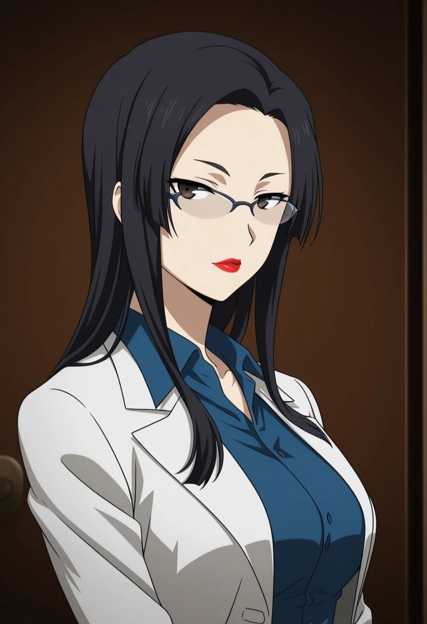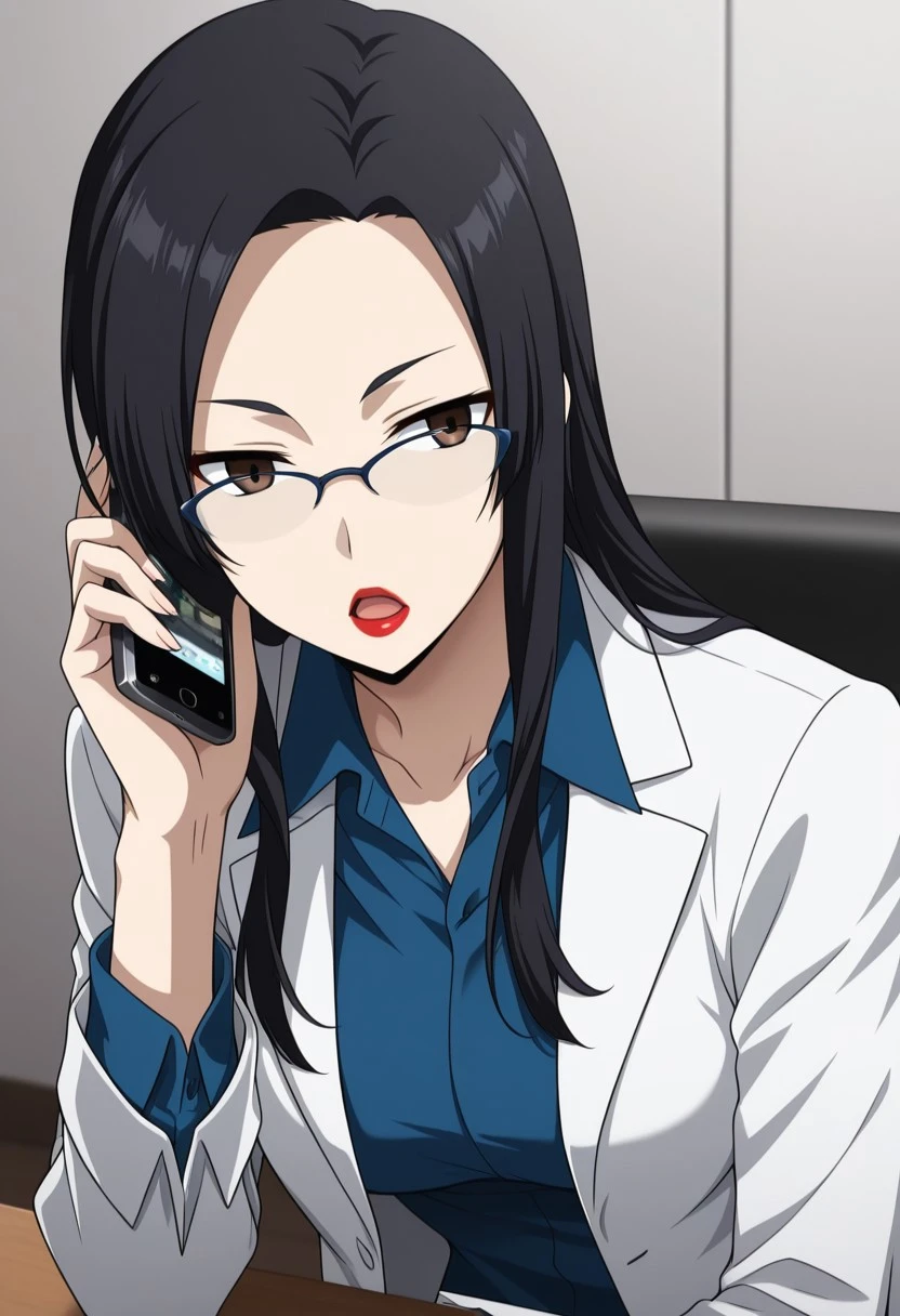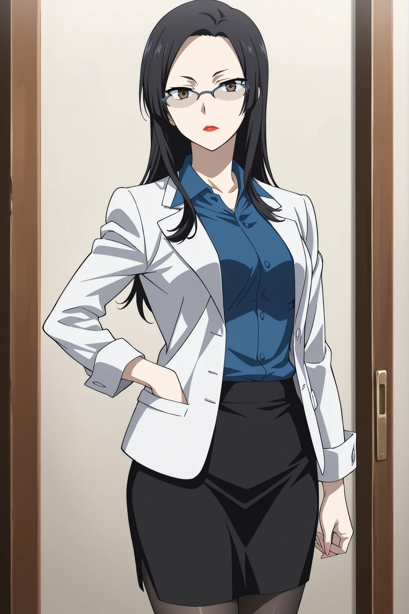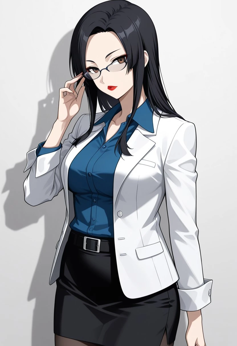 long hair,black hair, brown eyes, glasses, lipstick,white business suit,blue collared shirt,black pencil skirt,pantyhose,