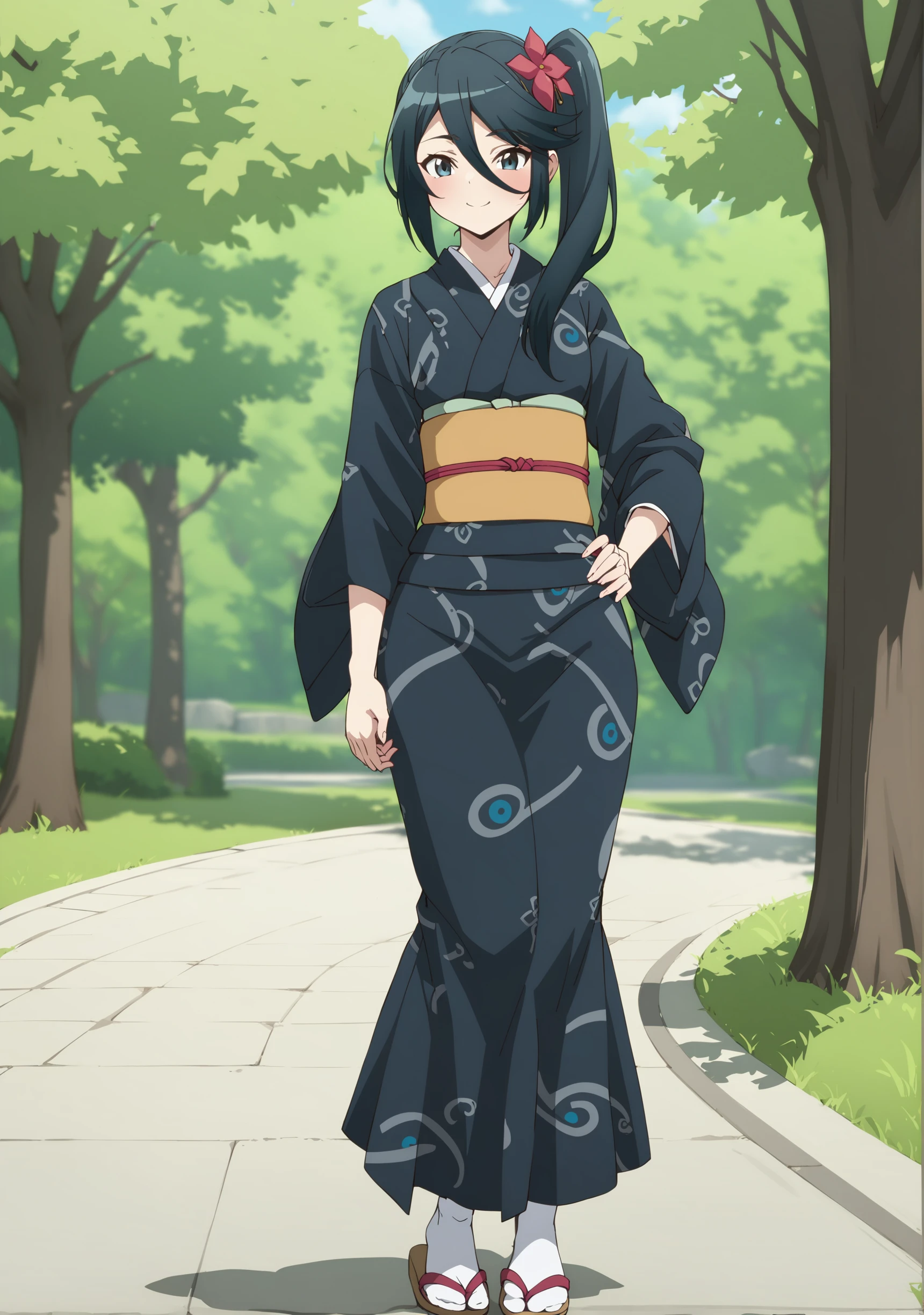 Outfit : Japanese cloth, black kimono, kimono, obi, white socks, wooden sandals,