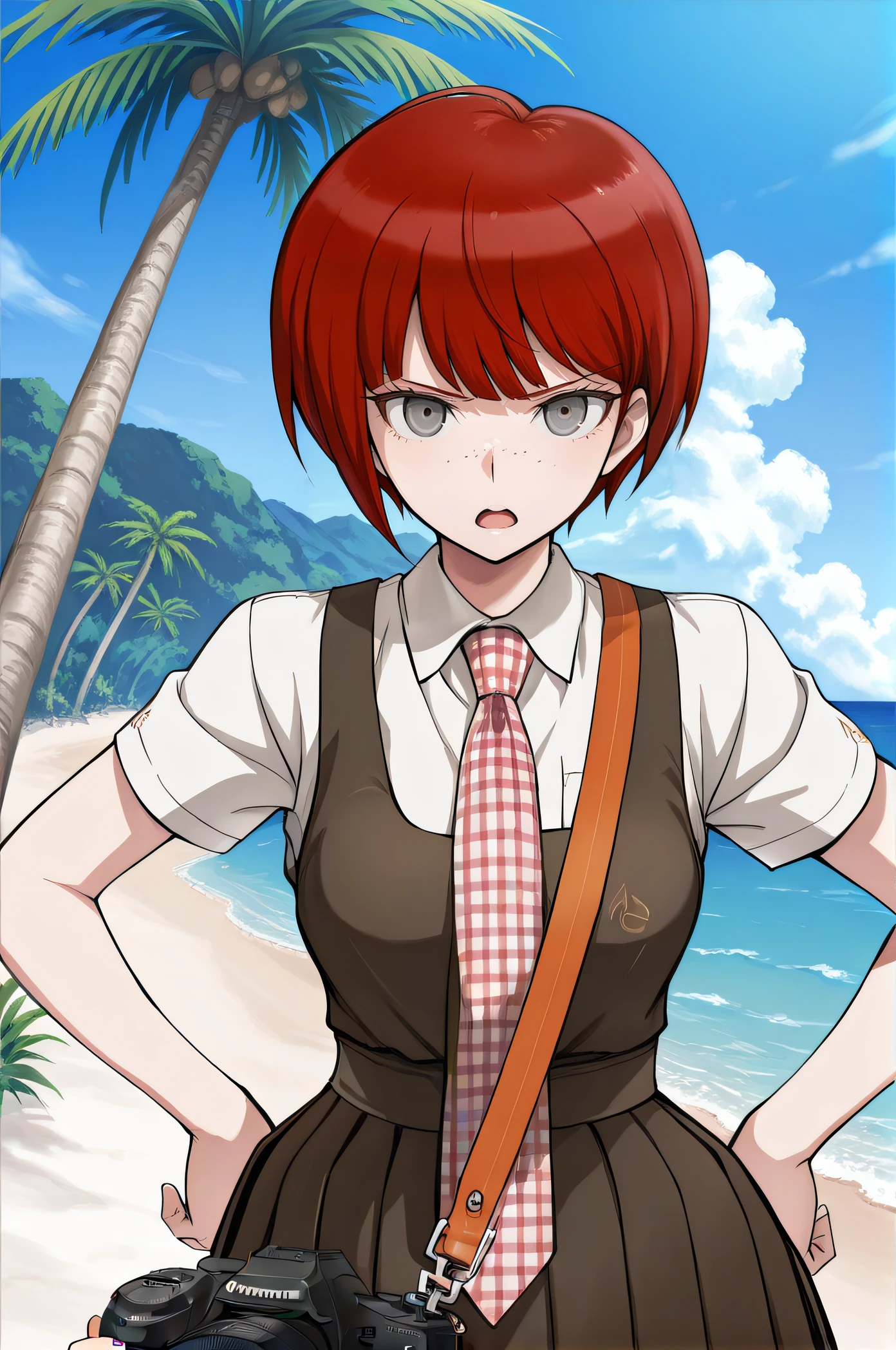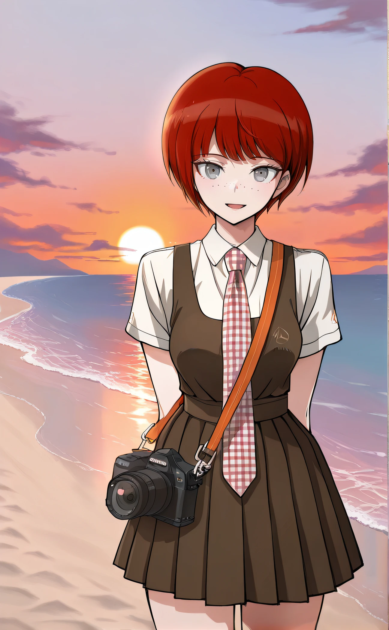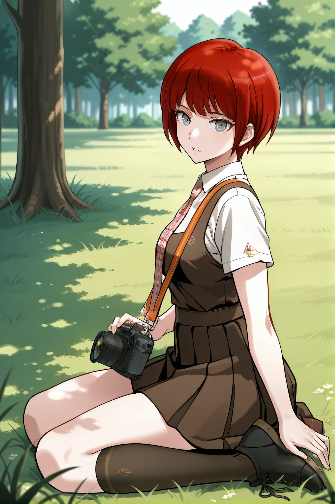 white shirt, short sleeves, plaid necktie, pinafore dress, camera, kneehighs, black shoes